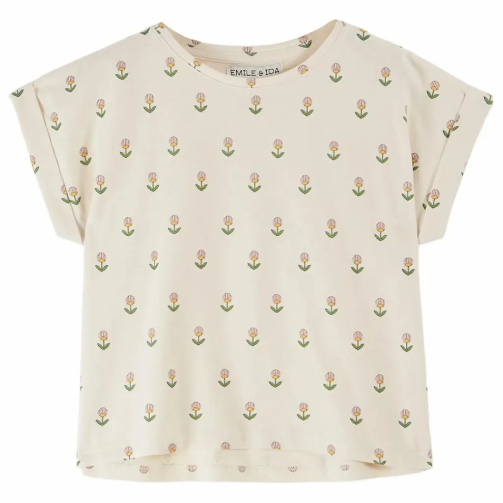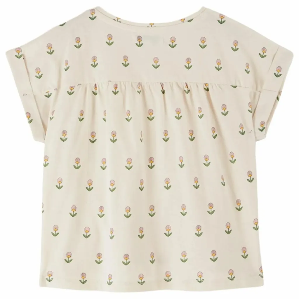 - Tee-shirt en jersey de coton écru biologique, orné de belles fleurs aux pétales roses, délicatement alignées, rappelant l’harmonie d’un jardin à la française. Nos stylistes seraient-elles des émules d’André Le Notre ?