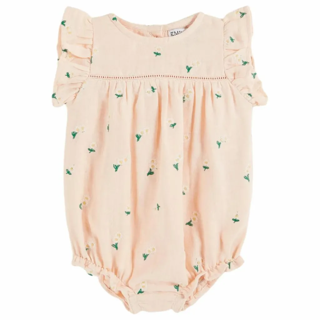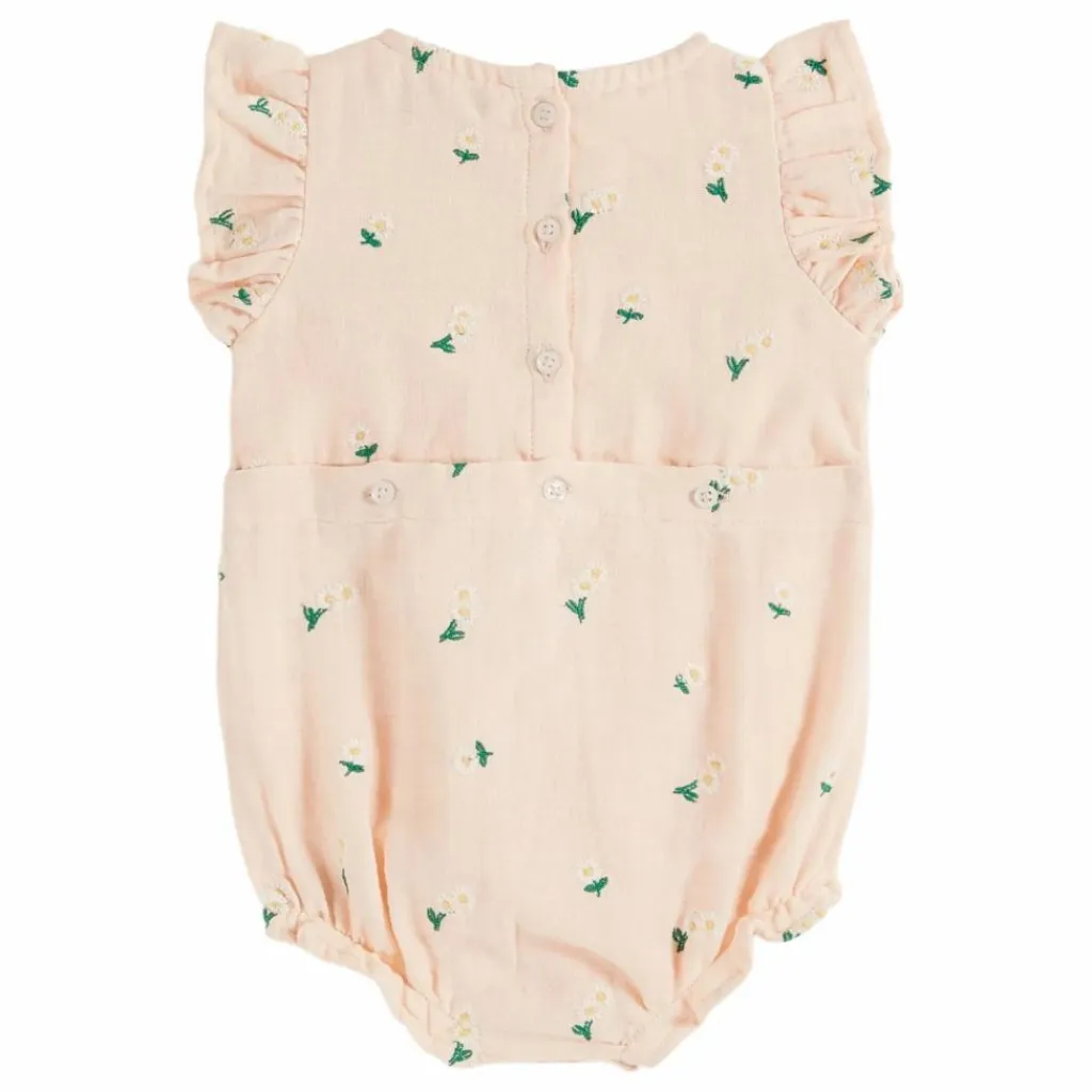 - Combibloomer en gaze de coton rose pastel, brodé de marguerites en all-over. Un galon de jours échelle ton sur ton s’inscrit délicatement entre l’empiècement et le corps de la barboteuse : exquis. Des volants autour des emmanchures apportent une touche de délicatesse.