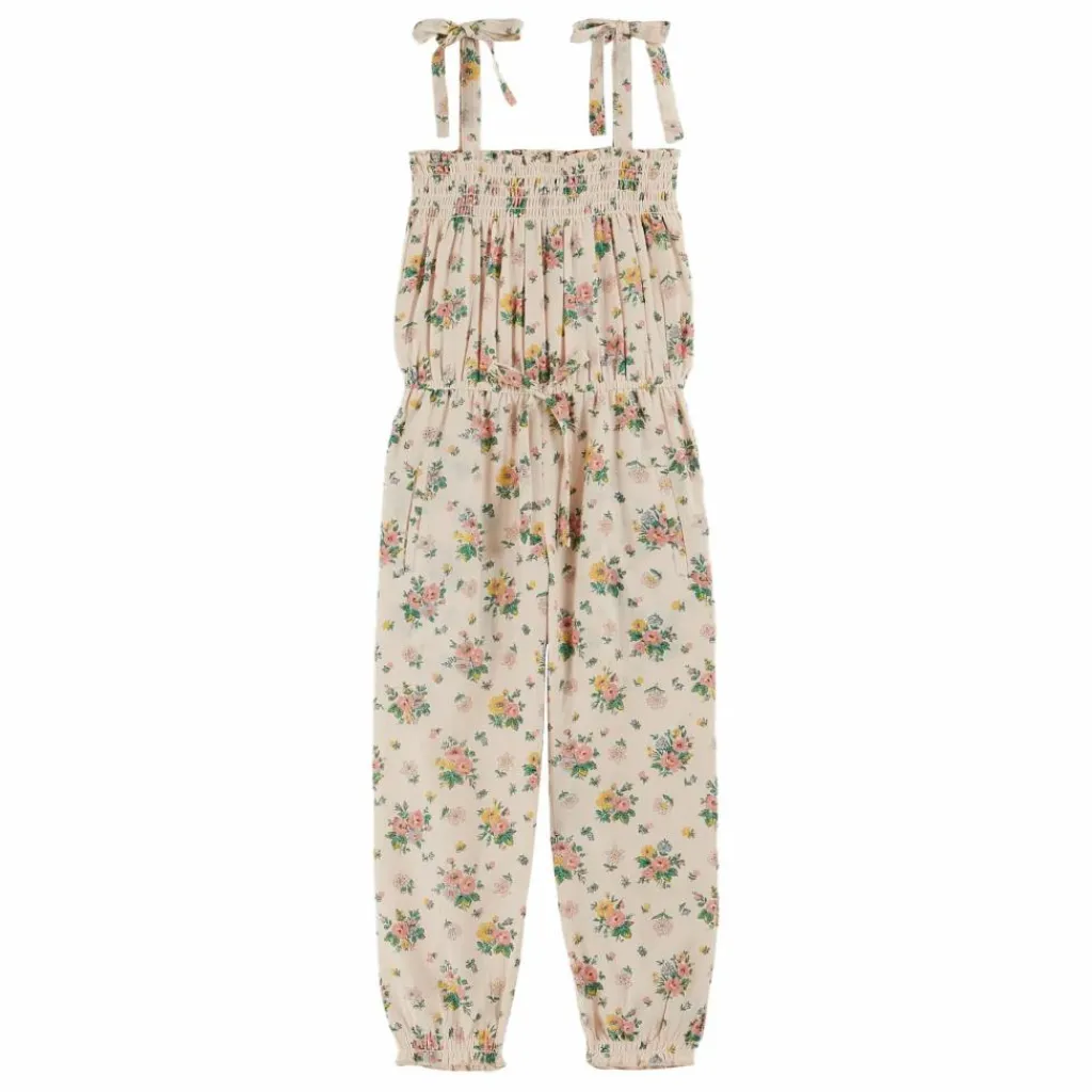 - Combinaison en gaze de coton sur laquelle sont imprimés des rinceaux fleuris et feuillagés aux tonalités roses et vertes, mis en valeur par le fond beige poudré.