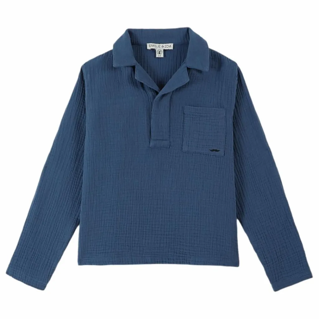 Petit col tailleur, deux manches longues et une poche poitrine brodée de la moustache noire, emblème historique de Emile et Ida pour passer des moments confortables. Et pour que le confort soit encore meilleur nous avons ajouté un empiècement dans le dos qui soutient un pli plat. Un bouton caché ferme la petite patte de boutonnage.