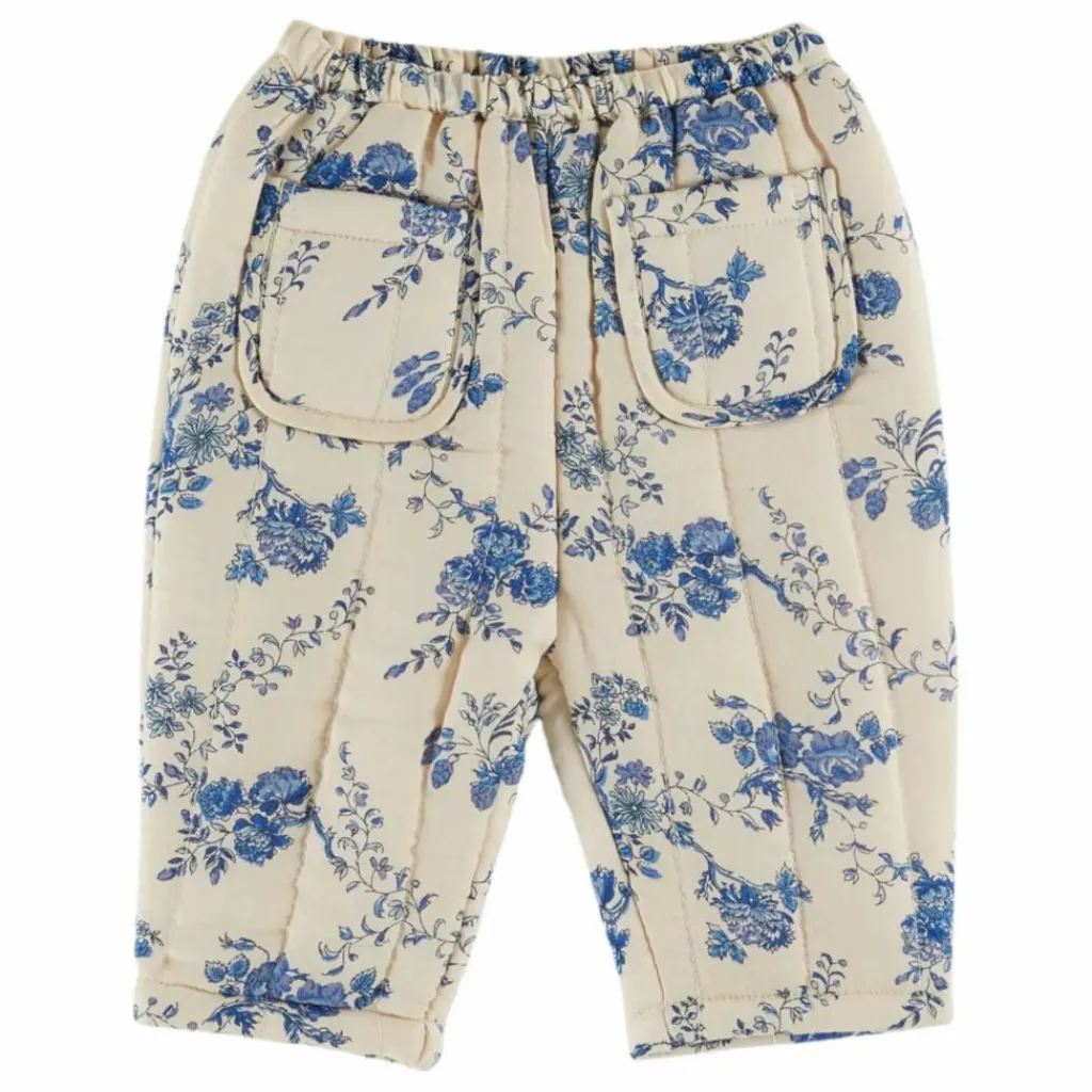 - Pantalon matelassé en coton écru orné de fleurs bleues sur fond écru.