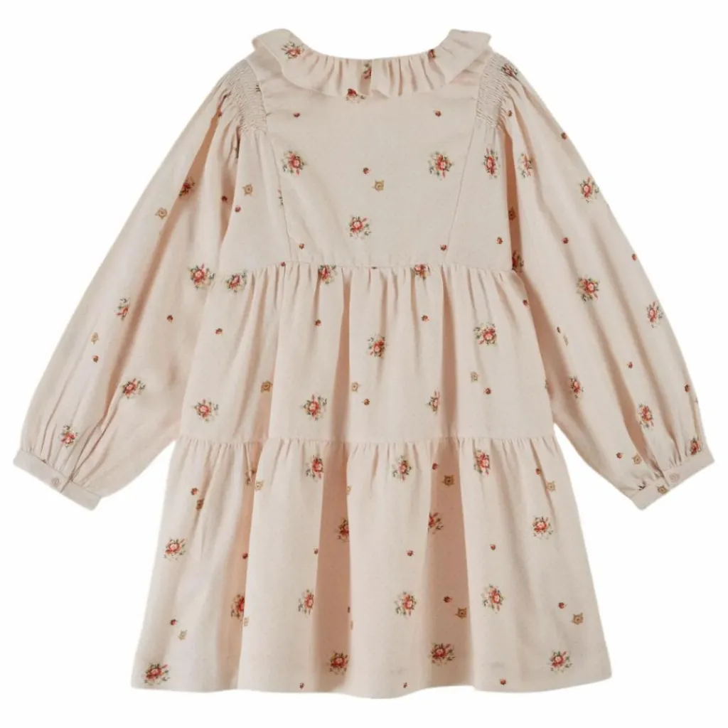 - Robe à étages en flanelle de coton toute douce, imprimée de grains de bouquets de fleurettes multicolores sur un fond rose très pâle. Les découpes du corsage et les bouillonnés en tête de manches structurent la forme.