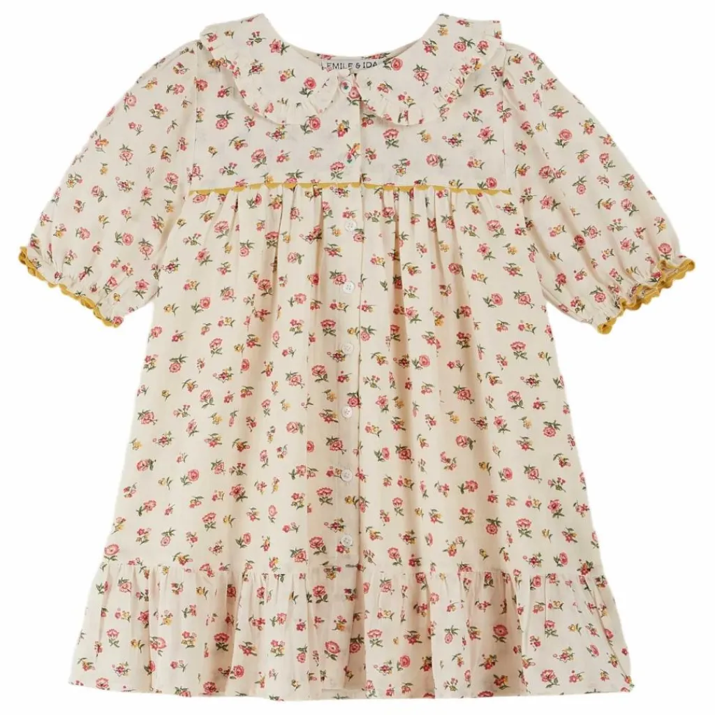 Un imprimé qui apporte de la fraîcheur et de la poésie. Une matière qui dispense de la douceur. Une forme ample, procurée par les fronces soutenues par les empiècements devant et dos, soulignée à la taille, tout comme le bas des manches ballon élastiquées, par un galon de croquet jaune. Le bas de la robe se termine par un volant qui fera tourner bien des têtes. Le col plat est festonné comme des pétales puis terminé par un étroit volant. Quant aux assemblages, ils sont réalisés en couture anglaise et la robe, qui s’ouvre devant sur toute la hauteur, est entièrement doublée. Les deux premiers boutons sont brodés de fleurs à la main. Délicat.