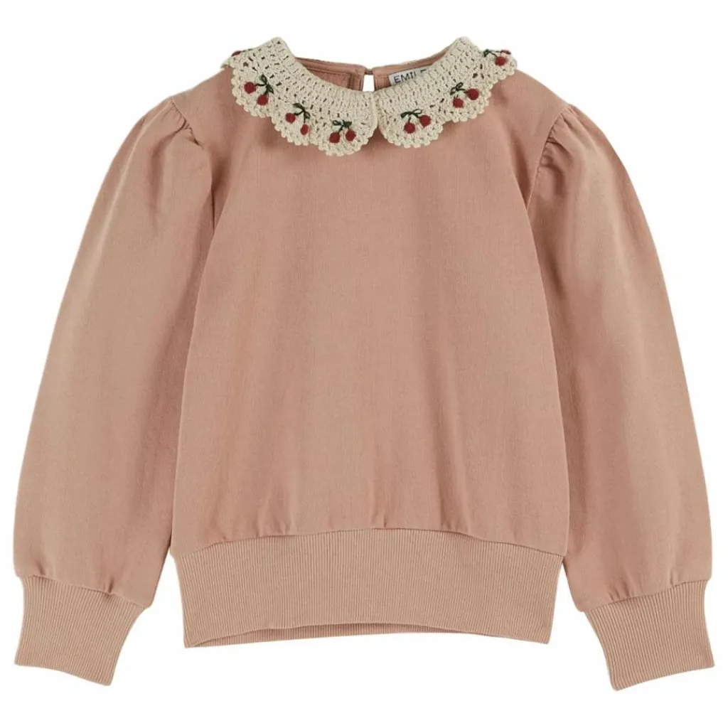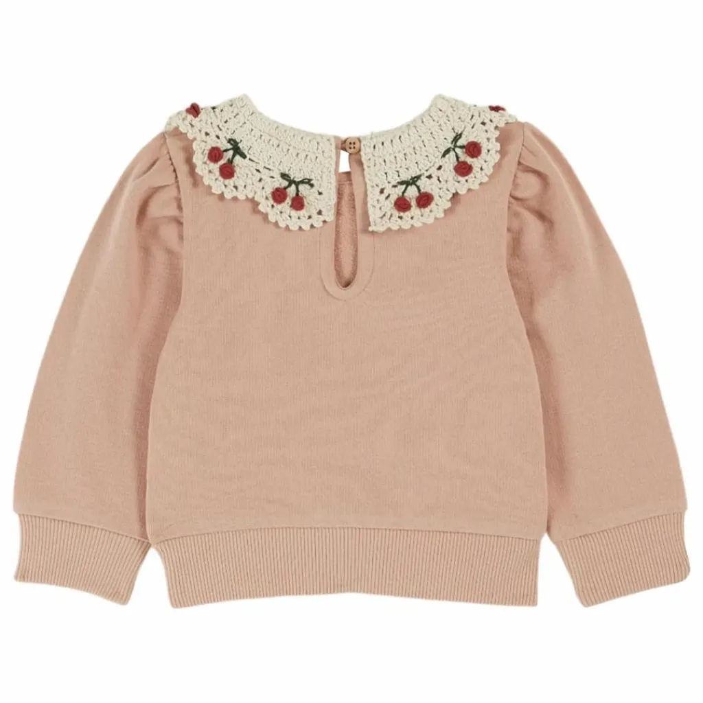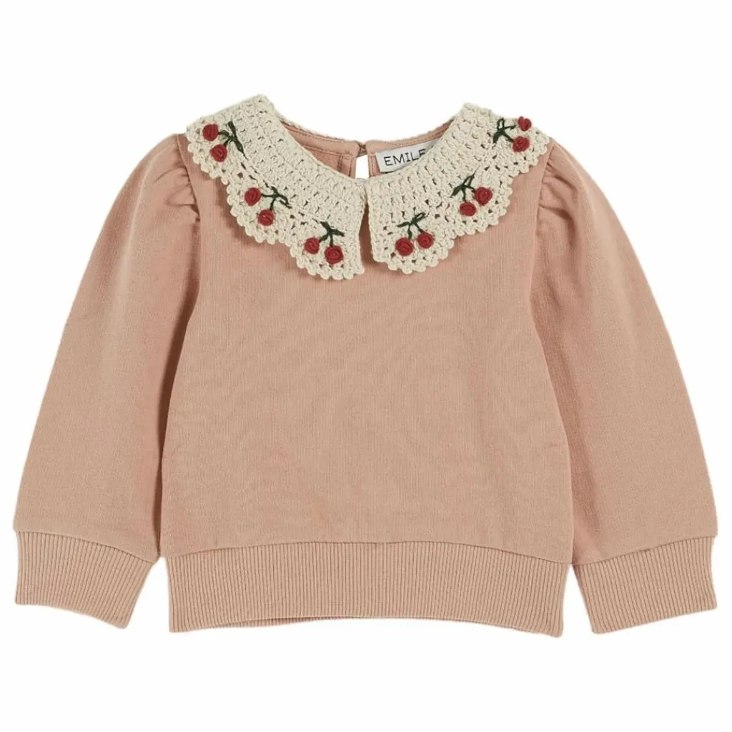 - Sweatshirt en jersey de coton biologique écru. Un sweat qui pourrait ressembler à tous les sweats avec des manches longues, une encolure ras du cou et du bord-côte autour des poignets et de la base. Mais le col fait la différence. Il est crocheté en coton ton sur ton et rebrodé à la main de petites cerises roses par des artisans indiens. Une ouverture goutte dans le dos avec sa bride et son bouton en bois permet de passer facilement la tête sans s’arracher les oreilles.