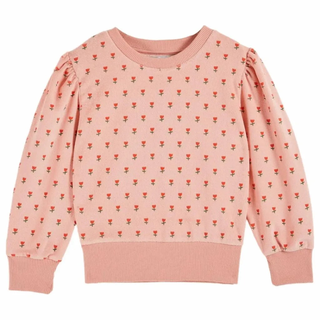 - Sweatshirt en jersey éponge de coton et de polyester rose, imprimé de tulipes aux pétales rouge vermillon, aussi bien alignées que dans un jardin à la française. Nos stylistes seraient-elles des émules d’André Le Nôtre ?