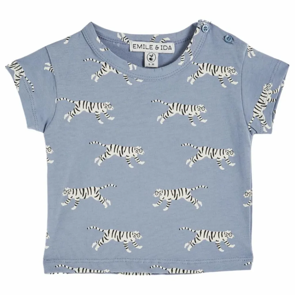 - Tee-shirt en jersey de coton biologique orange, imprimé de tigres blancs à lunettes. Myopes, ces félins ? Ils courent, sautent et gambadent sur tout le tee-shirt, du haut en bas, du devant au dos, en passant par les manches courtes. Ils ne sortent jamais du tee-shirt, ni en sautant l’encolure ras-du-cou, ni en s’échappant par la base, ni même en franchissant les manches.