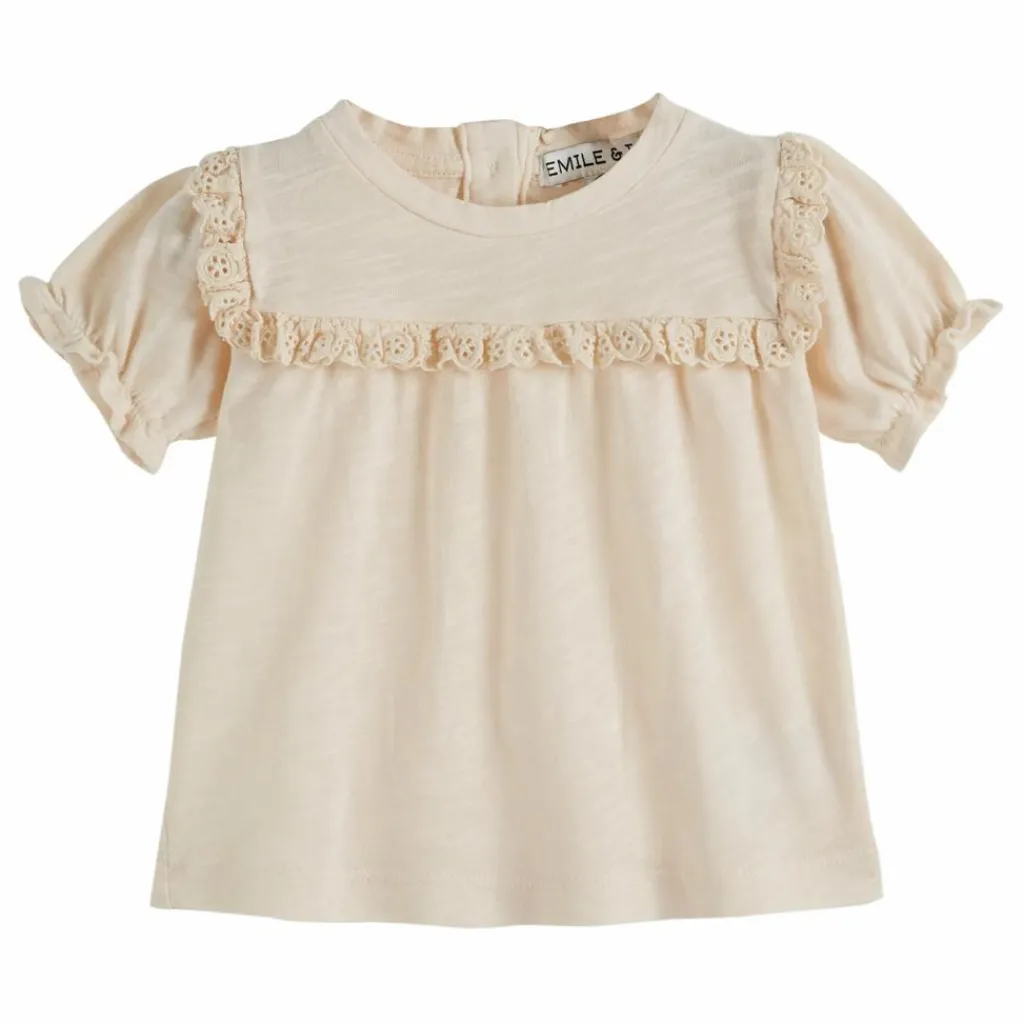 - Manches courtes bouffantes, Encolure ronde, Bords volantés