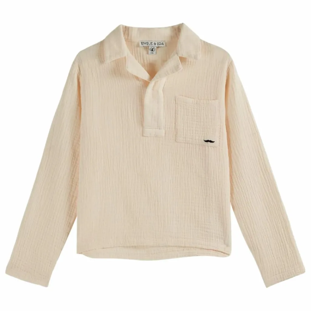 Petit col tailleur, deux manches longues et une poche poitrine brodée de la moustache noire, emblème historique de Emile et Ida pour passer des moments confortables. Et pour que le confort soit encore meilleur nous avons ajouté un empiècement dans le dos qui soutient un pli plat. Un bouton caché ferme la petite patte de boutonnage.