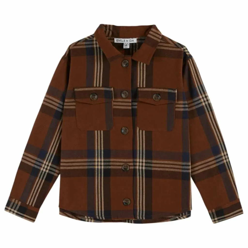- Chemise en flanelle de coton marron quadrillé de lignes blanches et noires.