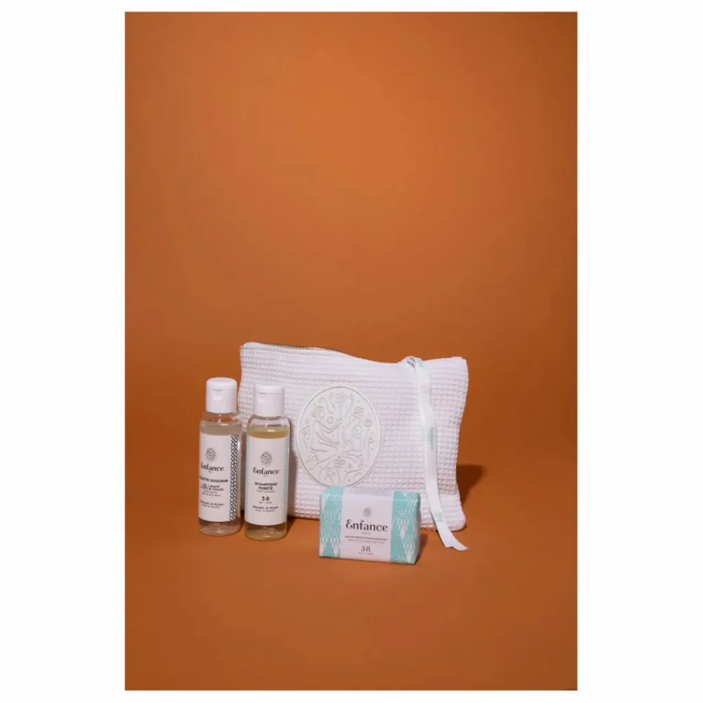 Contient le savon protecteur apaisant 3-8 ans (100 g), le gel lavant douceur (100 ml) et le shampoing douceur 3-8 ans (100 ml). Pochette 100% waterproof en vinyle souple avec ses finitions en cuir vegan et zip doré.