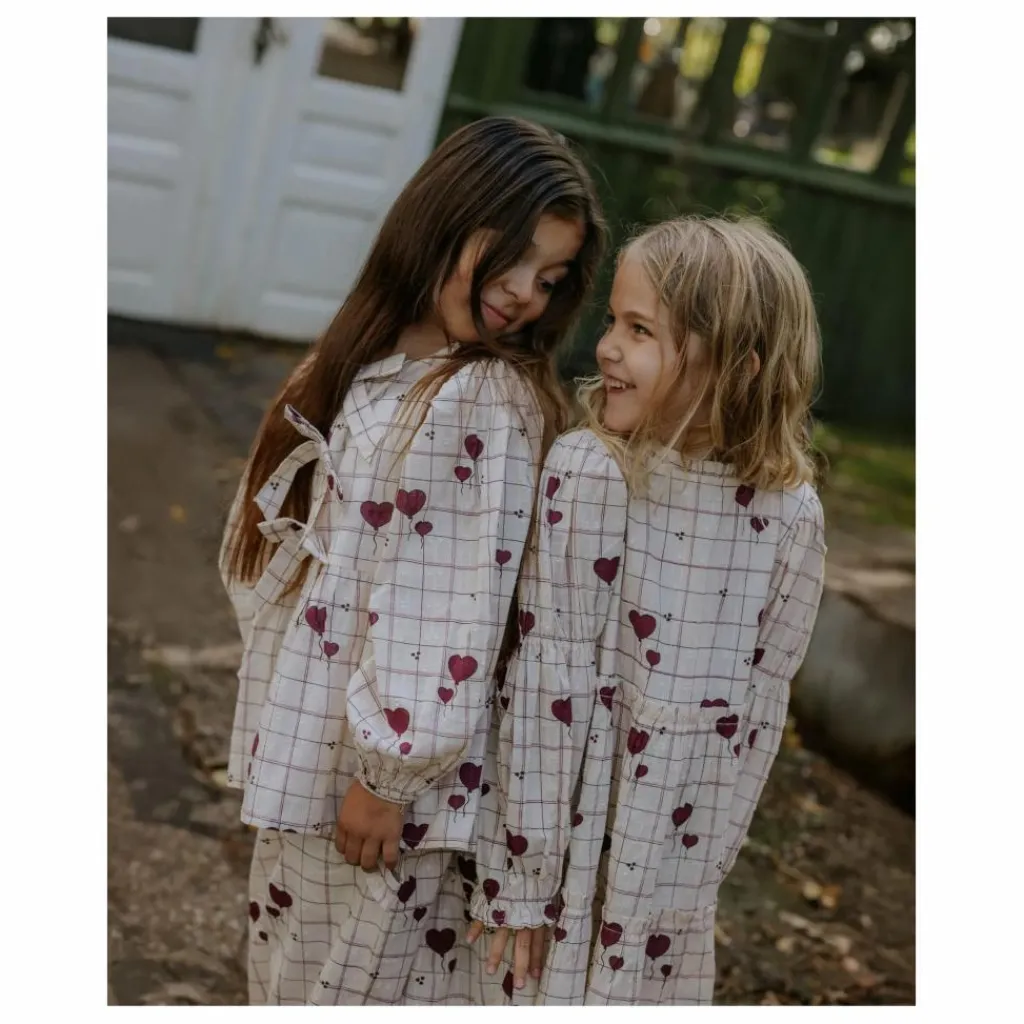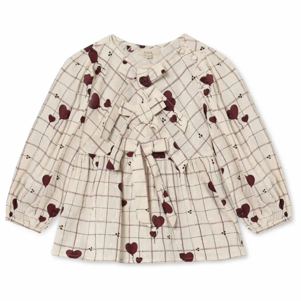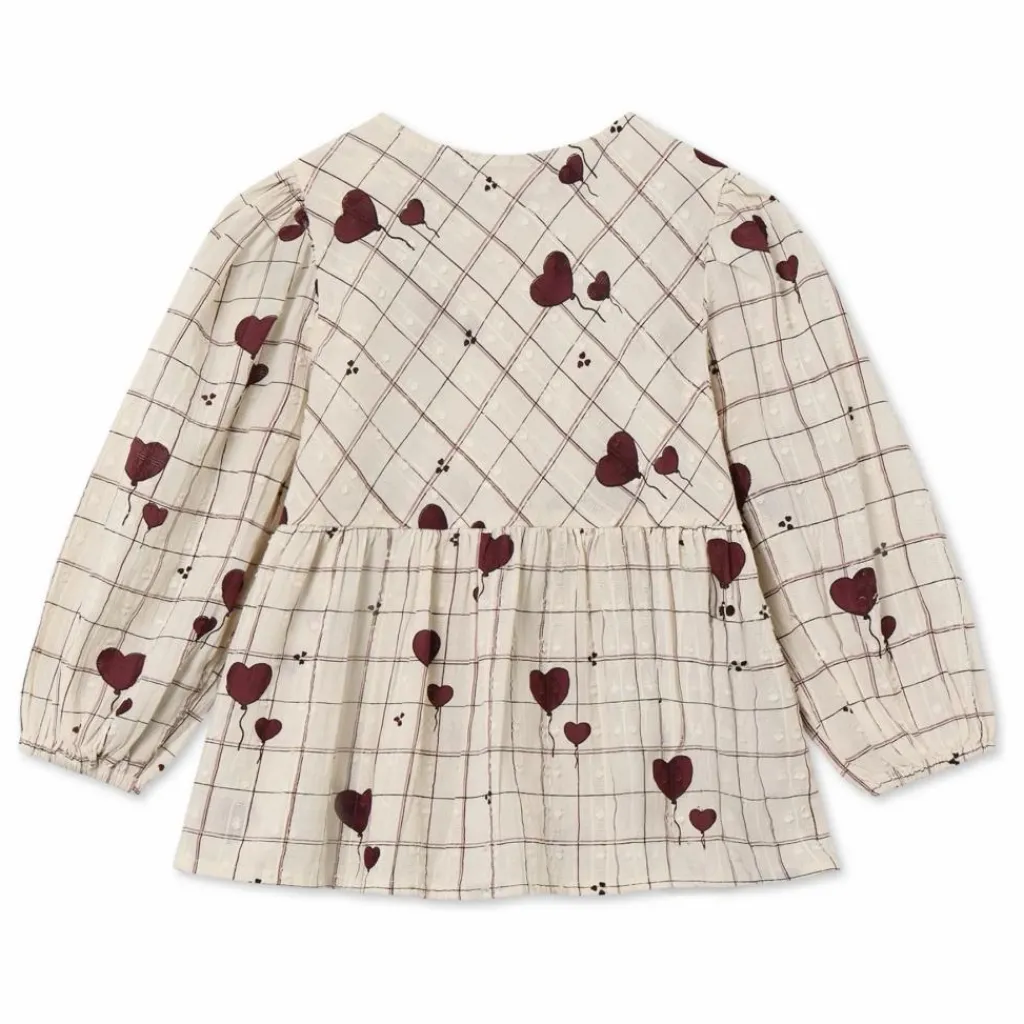 - Chemisier léger à manches longues en coton doux, imprimé de carreaux et de ballons en forme de cœur. Le chemisier a des manches volumineuses, des fronces à l’épaule et un élastique aux poignets. Une couture à la taille avec une jupe donne du volume à la blouse. L’encolure est ronde et des boutons recouverts de tissu sont placés sur l’épaule pour faciliter l’enfilage et le désenfilage. Le chemisier est décoré de nœuds sur le devant, ce qui lui confère une allure féminine et douce.