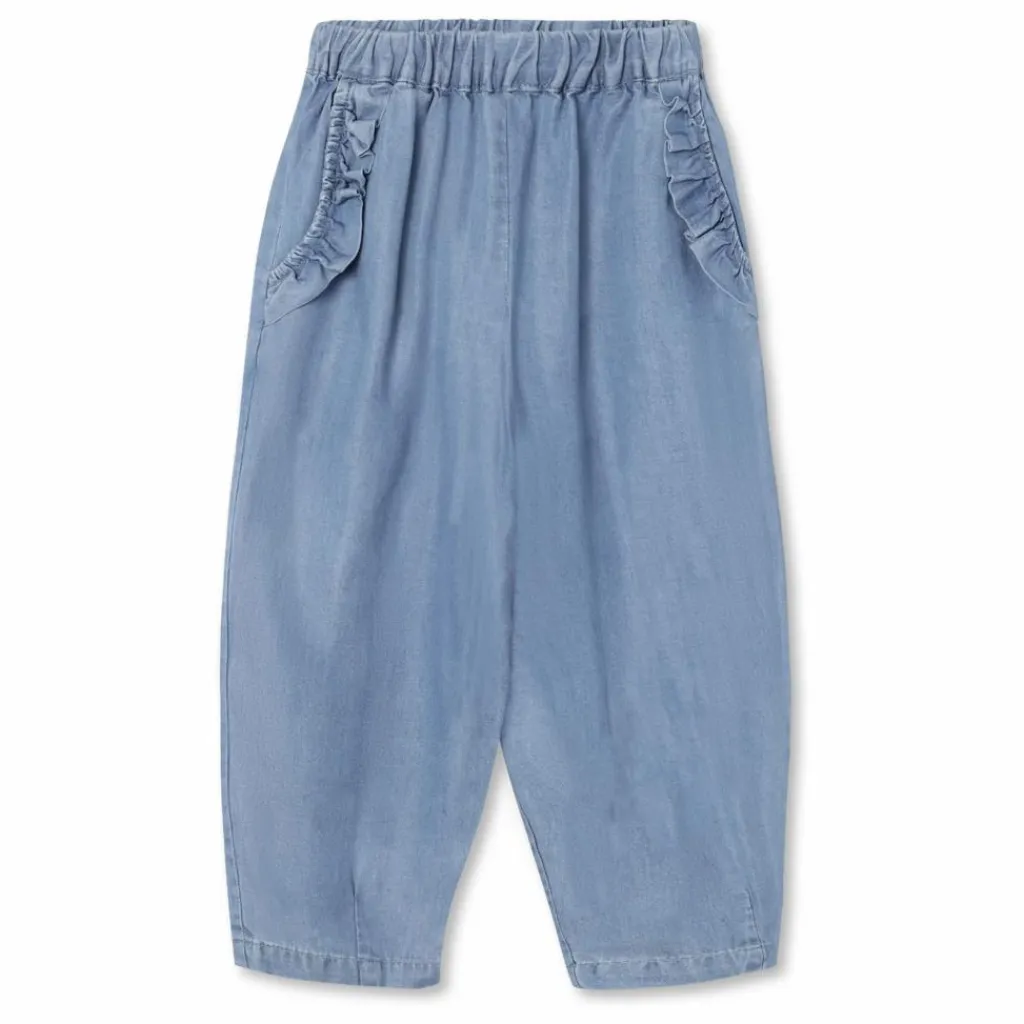 - Pantalon souple en maille ample. Le pantalon a des poches inclinées sur le devant avec des volants. Au dos, il a une seule poche avec des volants le long du bord et une broderie avec un ballon en forme de cœur.
