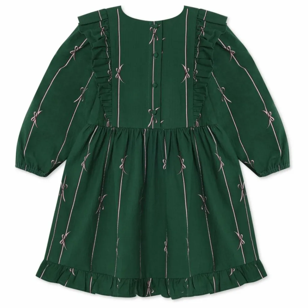 La robe présente un bel imprimé avec des nœuds dans de jolies couleurs, vert et rose.