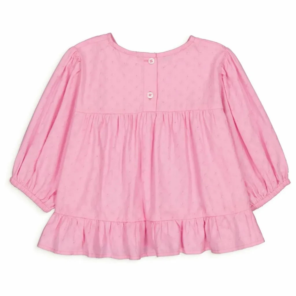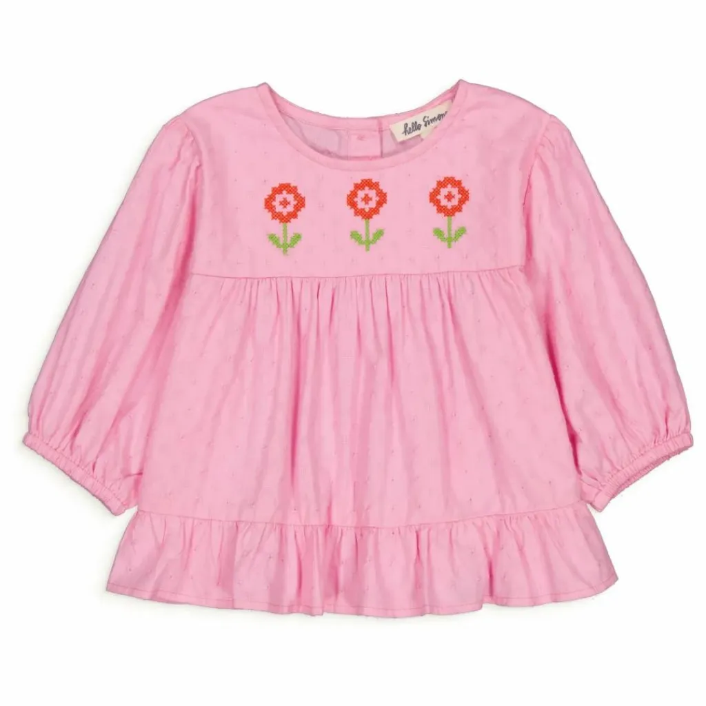 - Chemisier court et volumineux en ratière avec empiècement plat et froncé en bas. Manches bouffantes au-dessus du coude. Col rond et dos boutonné. Broderie de fleurs sur l’empiècement devant. Le modèle mesure 124 cm et porte une taille 6Y. Le chemisier sera 4cm plus long en production.
