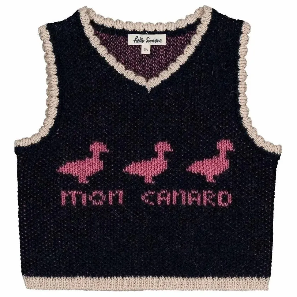- Gilet en tricot sans manches avec motif placé. Ourlet resserré. Encolure en V et emmanchures larges. Bordure en scalopp contrastée sur l’encolure et les emmanchures.