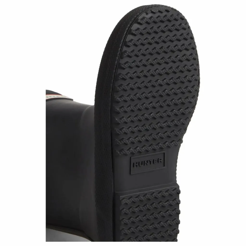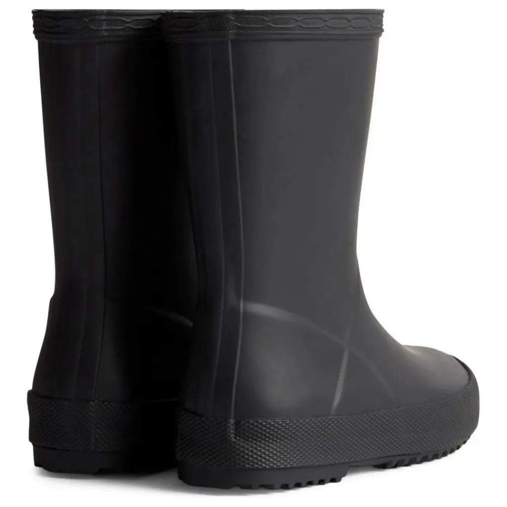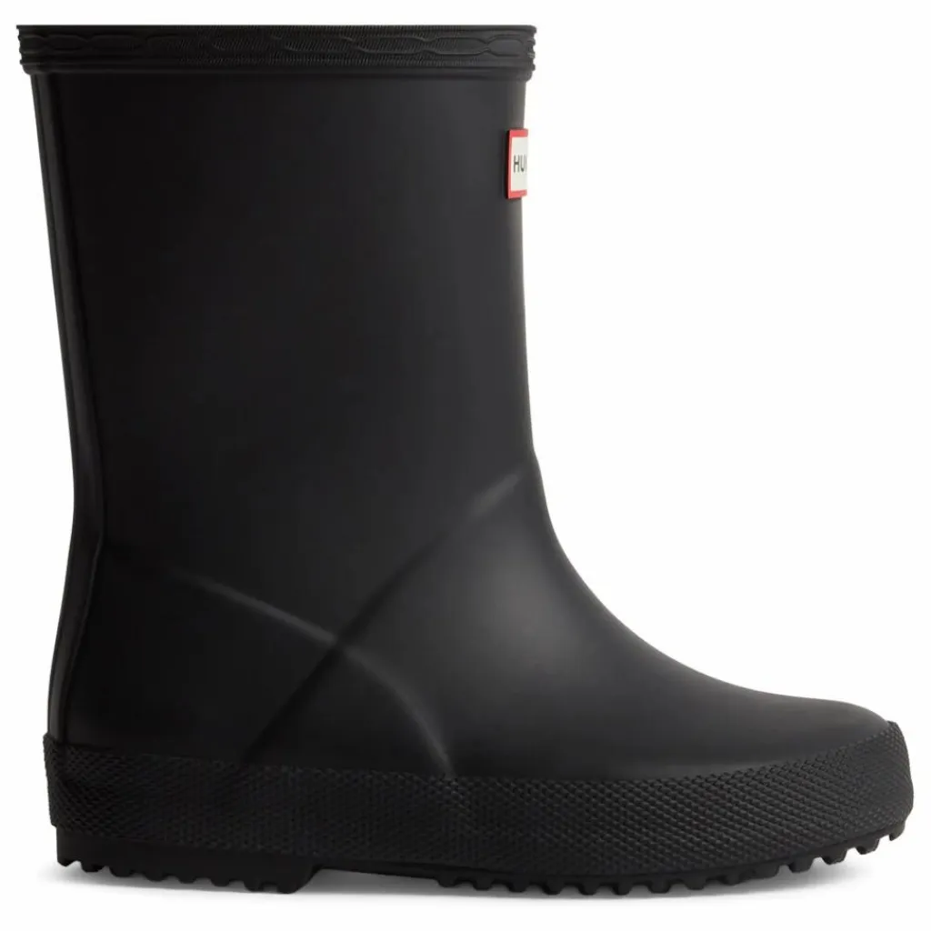 - La Kids First Classic Wellington Boot a été mise à jour avec une nouvelle semelle améliorée. Parfaites pour éclabousser les flaques d’eau, ces bottes noires pour enfants sont fabriquées à la main en caoutchouc naturel, entièrement imperméables et dotées d’une semelle texturée/zigzag plus profonde spécialement conçue pour réduire les risques de glissade. Avec une doublure en polyester 100 % recyclé et un bout arrondi qui permet aux petits pieds de bouger, elles assurent un confort total pour chaque aventure. Nous recommandons que toutes les bottes Hunter soient portées avec des chaussettes pour protéger la peau du porteur du contact avec le caoutchouc.