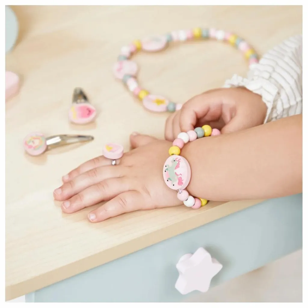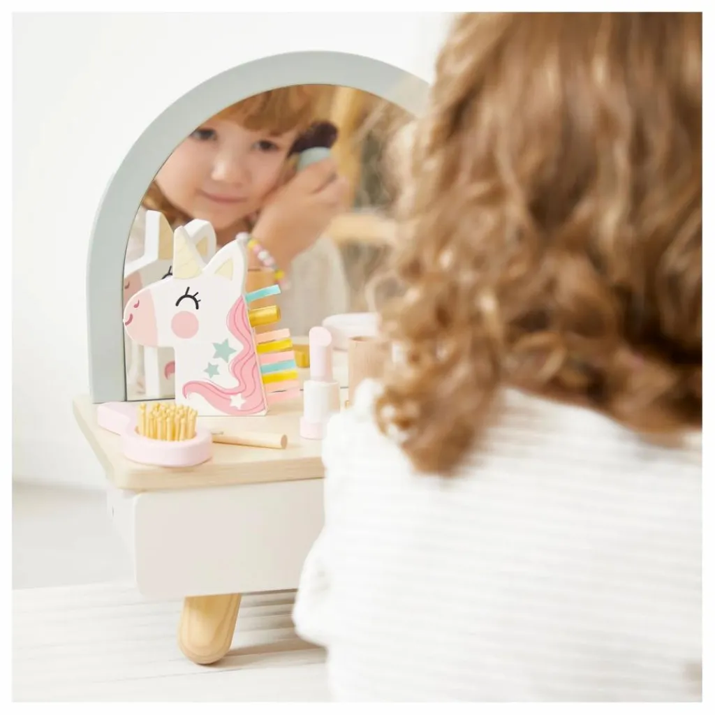 - Cette grande coiffeuse, son tabouret et ses nombreux accessoires offriront à votre enfant un véritable univers de jeu et de créativité. Magique ! Elle dispose d’une trappe secrète magnétique pour cacher ses petits secrets. Également 3 accessoires de photo booth pour des heures d’amusement ! 4 magnets en forme d’étoiles et de licorne, une vraie brosse à cheveux et même une baguette magique ajoutent une touche de magie à chaque séance de jeu. Avec cette coiffeuse, votre enfant stimule son imagination, se pomponne et s’amuse comme les grands ! Jouet d’imitation en bois FSCTM pour les enfants à partir de 3 ans.