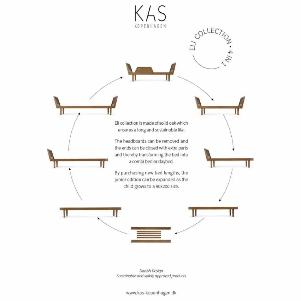- Ce design innovant et intemporel est fabriqué en chêne massif, ce qui lui confère un magnifique aspect nordique. La haute qualité de ce matériau garantit une durée de vie longue et durable. Les têtes de lit sont ergonomiques et il est confortable de s’y appuyer pour lire un livre ou surfer sur sa tablette, ce qui crée l’illusion d’un canapé. Les têtes de lit peuvent être retirées et les extrémités peuvent être fermées avec des pièces supplémentaires, transformant ainsi le lit en lit de jour. En achetant de nouvelles longueurs, l’édition junior peut être élargie au fur et à mesure que l’enfant grandit. Dans ce design, KAS Kopenhagen a donné la priorité à la création de meubles fonctionnels qui s’adressent à un large public et qui peuvent être utilisés partout : dans la chambre d’enfant comme lit, dans le salon, le bureau ou la maison de campagne comme lit de jour. Le lit Eli permet de jouer avec différents styles d’intérieur. Les pieds en forme de cône et les vis invincibles sont les caractéristiques de la signature de KAS Kopenhagens.