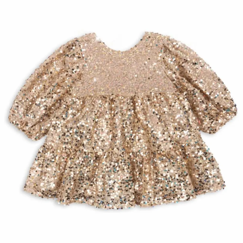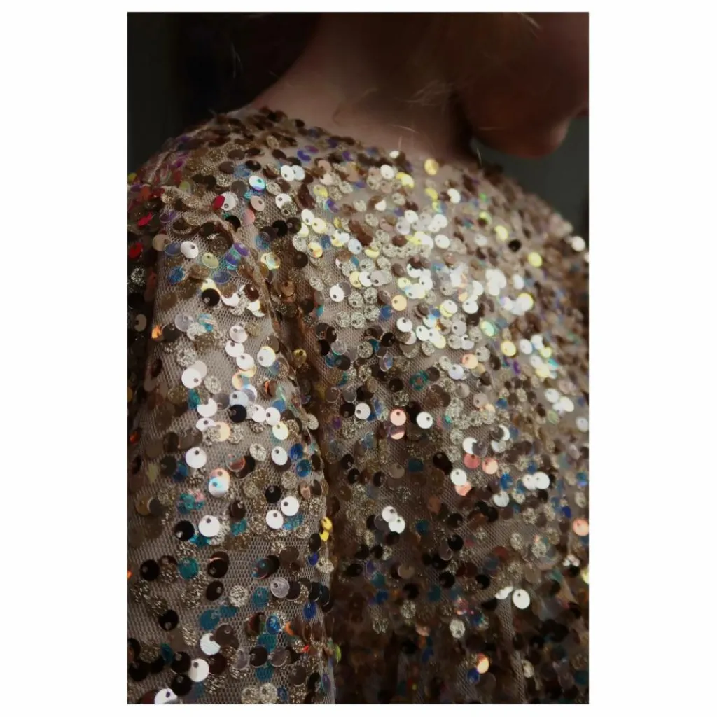 - La robe Lila est recouverte de paillettes étincelantes et présente des manches ballon décoratives et une jupe évasée avec une doublure en coton doux. 100% polyester avec une doublure en 100% coton.