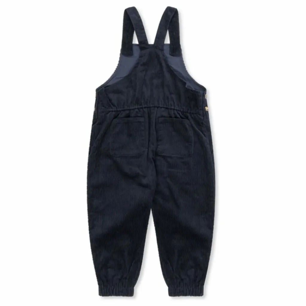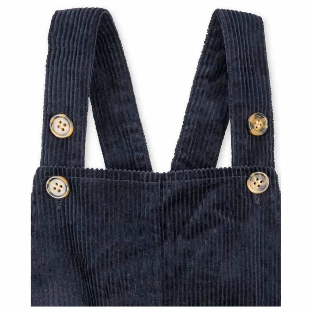 - Salopette Sully en velours côtelé doux. Conçue avec de larges bretelles qui se ferment à l’aide de boutons en corne classiques.