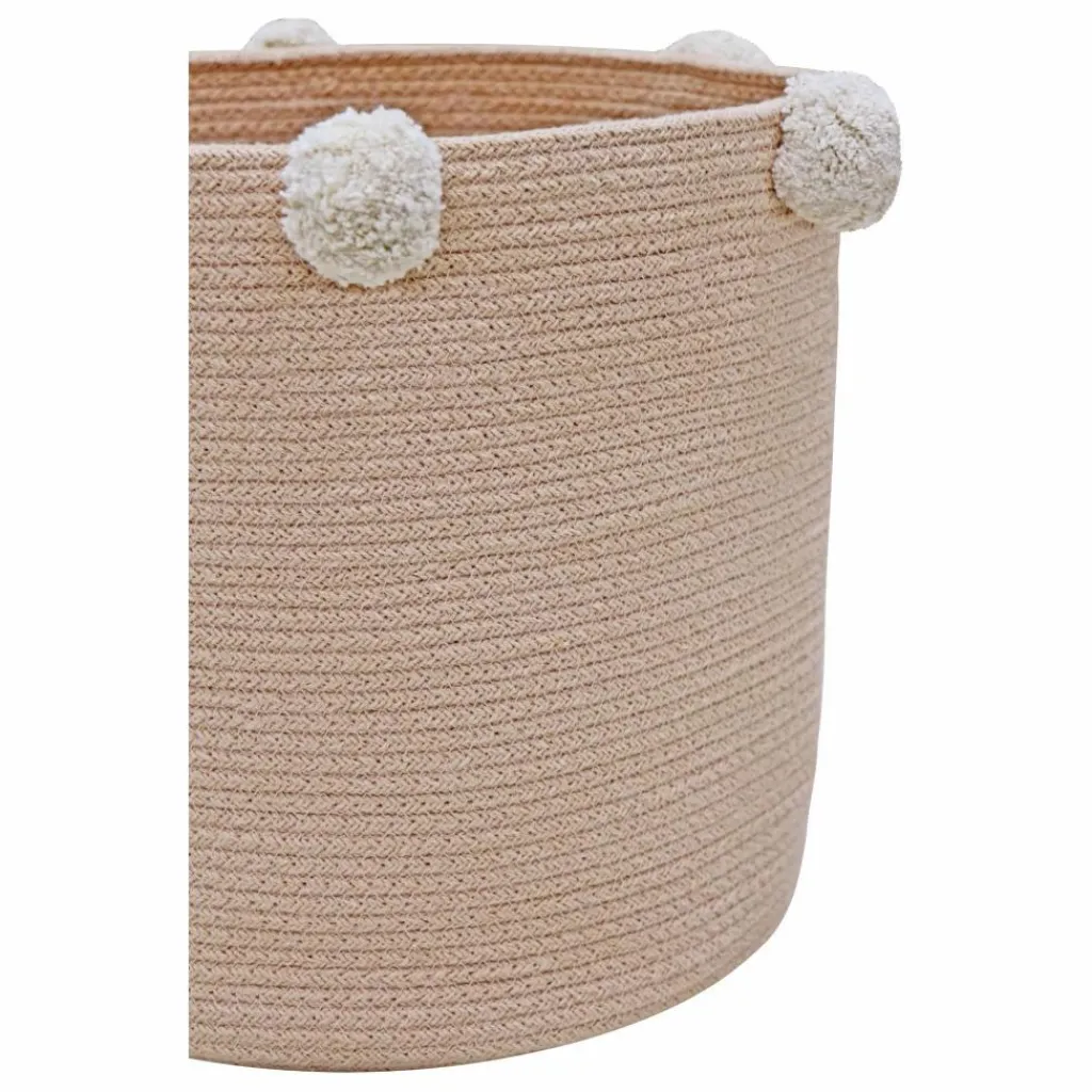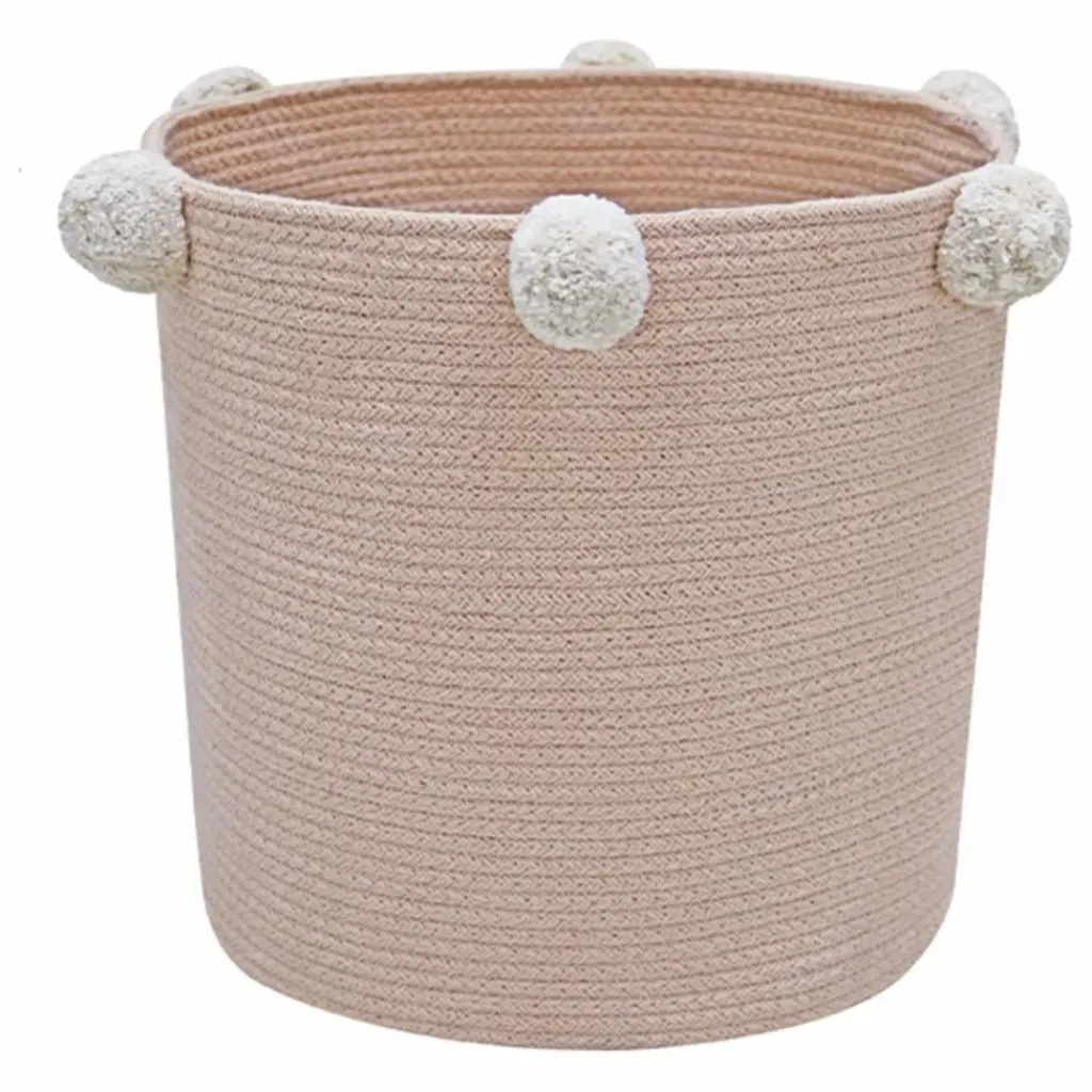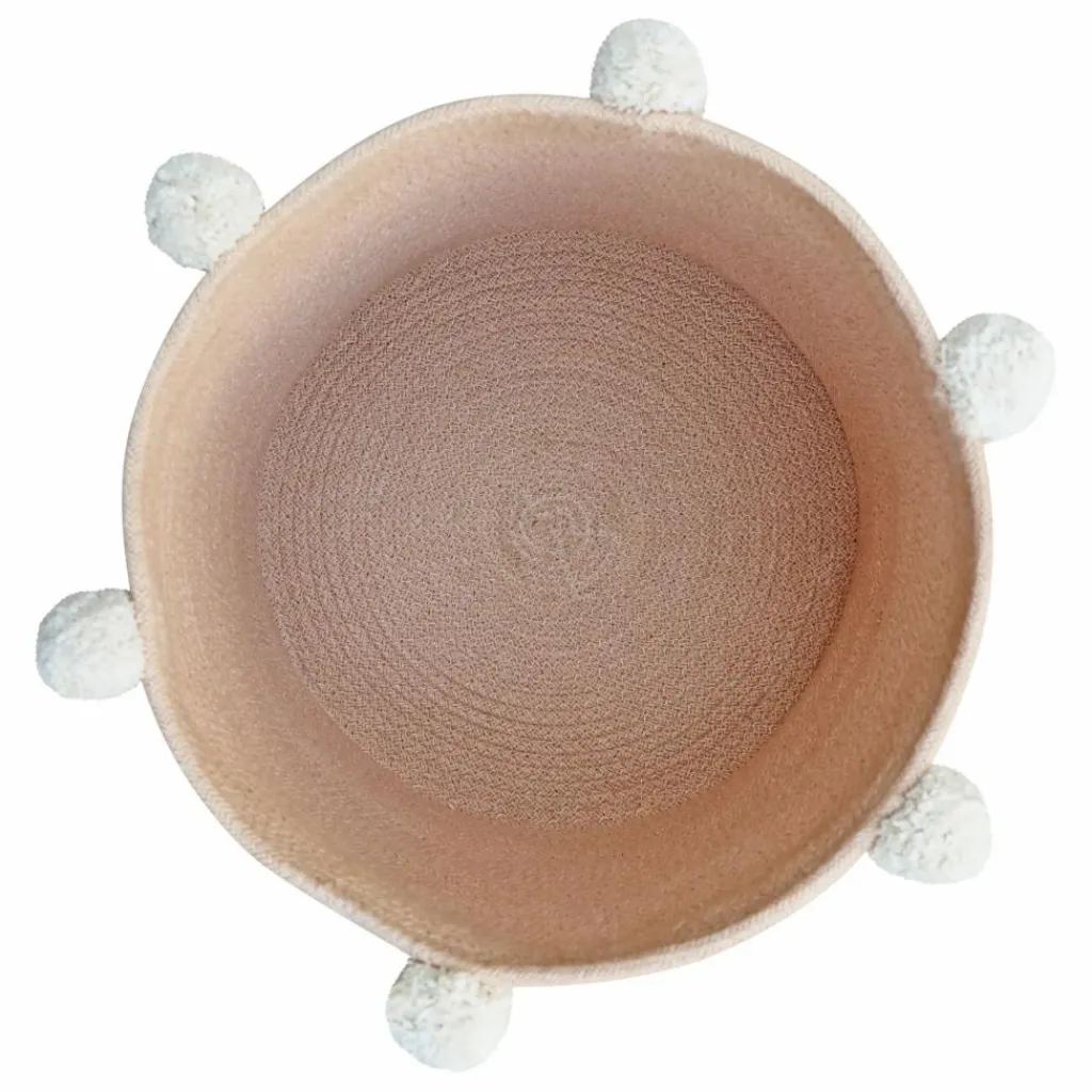 - Panier en cordon de coton tressé de couleur bleu sauge et fini avec 6 pompons en coton rose