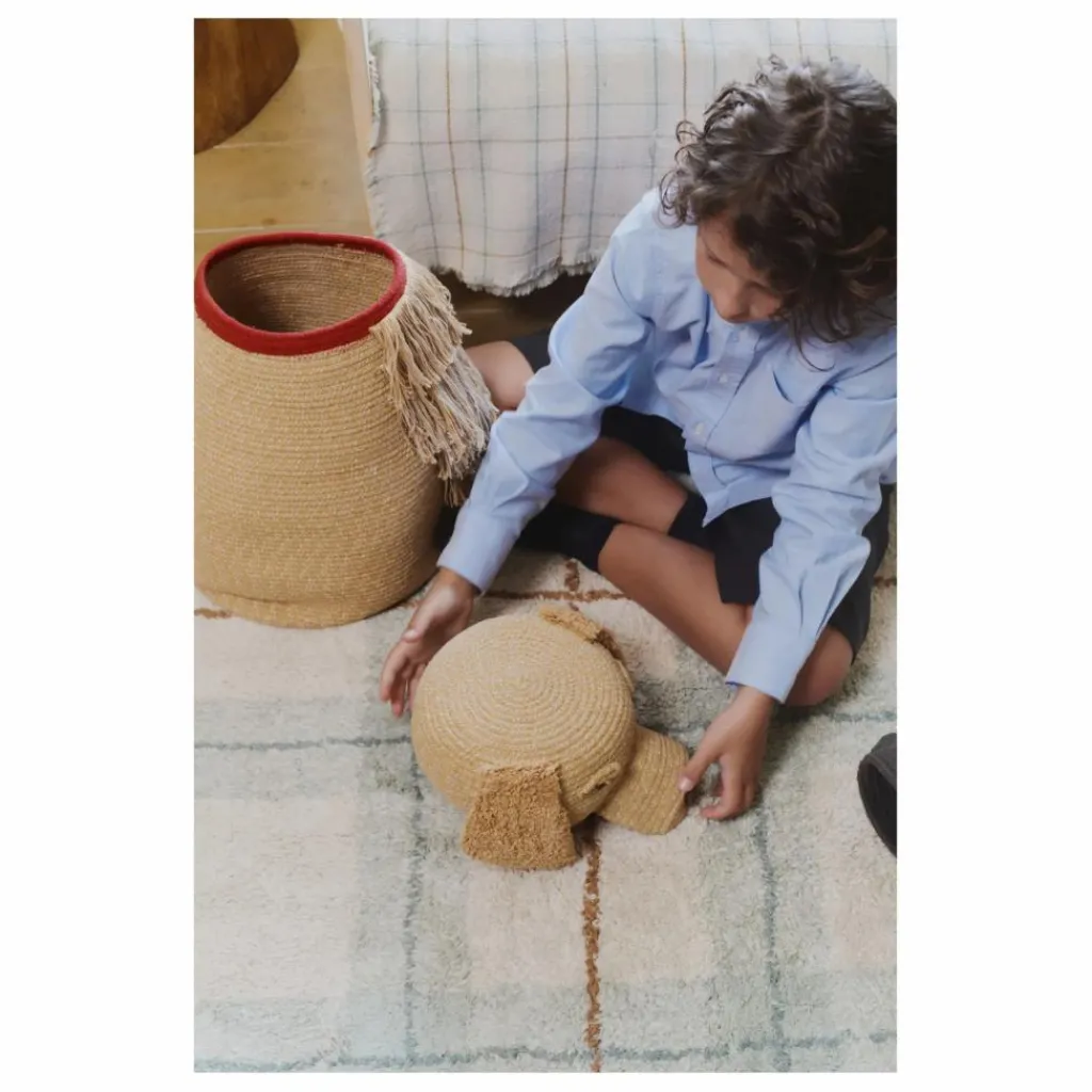 - Voici Luna ! Le tout premier chien de Lorena, né dans son enfance. Ce panier fait main s’inspire de la silhouette d’un Golden Retriever, confectionné à partir de cordons tressés provenant de bouteilles en PET recyclées et de notre coton LC signature. La tête est ornée d’oreilles doublées de toile, d’yeux soigneusement noués à la main, de sourcils touffus pour un regard doux et expressif, et d’un museau interactif avec une langue qui se déroule – oui, un moment de jeu supplémentaire ! Vous pouvez ouvrir et fermer la gueule, et la langue se déroule comme un Golden joyeux qui court partout. Les franges sur le devant et la queue frétillante imitent le pelage duveteux du chien. La queue est flexible, ce qui ajoute à son aspect réaliste et joyeux. Il est livré avec un petit os en peluche attaché à l’étiquette et un collier rouge pour la touche finale charmante.