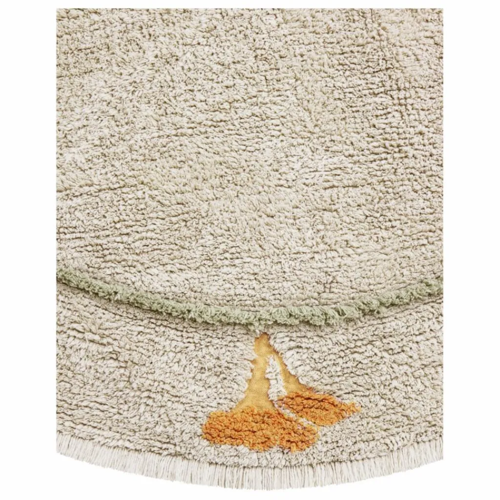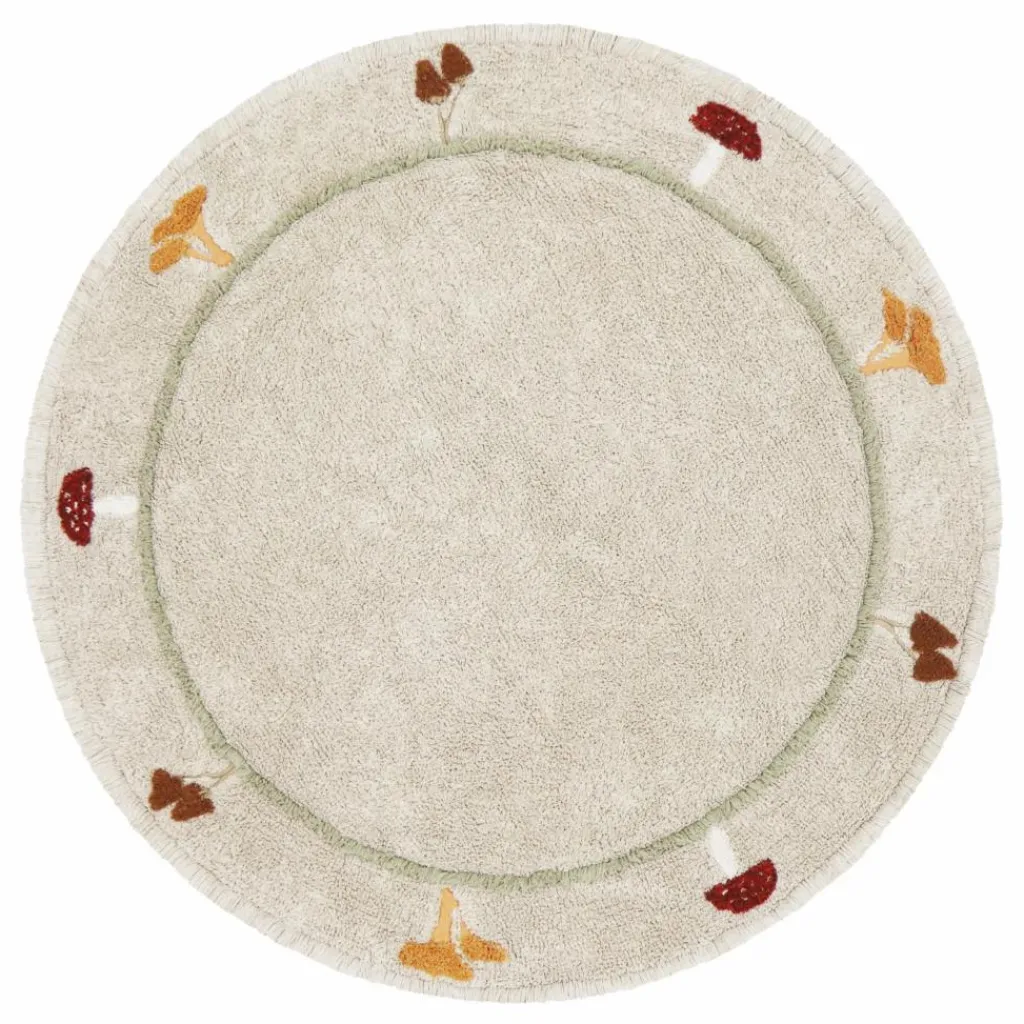 - Le tapis rond Chanterelle est décoré d’une bordure de différentes espèces de champignons comme les girolles et les morilles, associant des morceaux de toile à des motifs touffetés. Le tapis a une base naturelle, un cercle intérieur de poils légèrement plus longs en olive et des détails design en miel, bordeaux, caramel et ivoire.