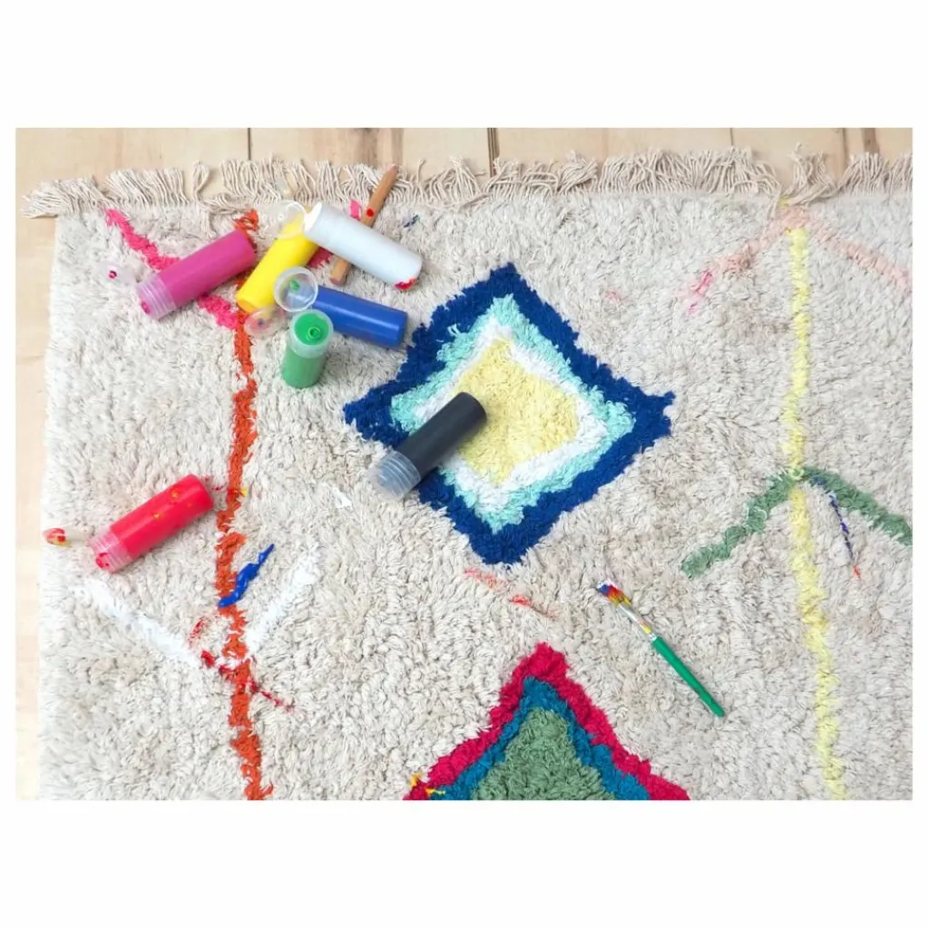 - Mini tapis lavable rectangulaire de couleur naturelle, avec des symboles d’inspiration ethnique dans des couleurs vives contrastées. Fini avec des franges de couleur naturelle sur les bords.Livré avec un sac à cordes pratique.