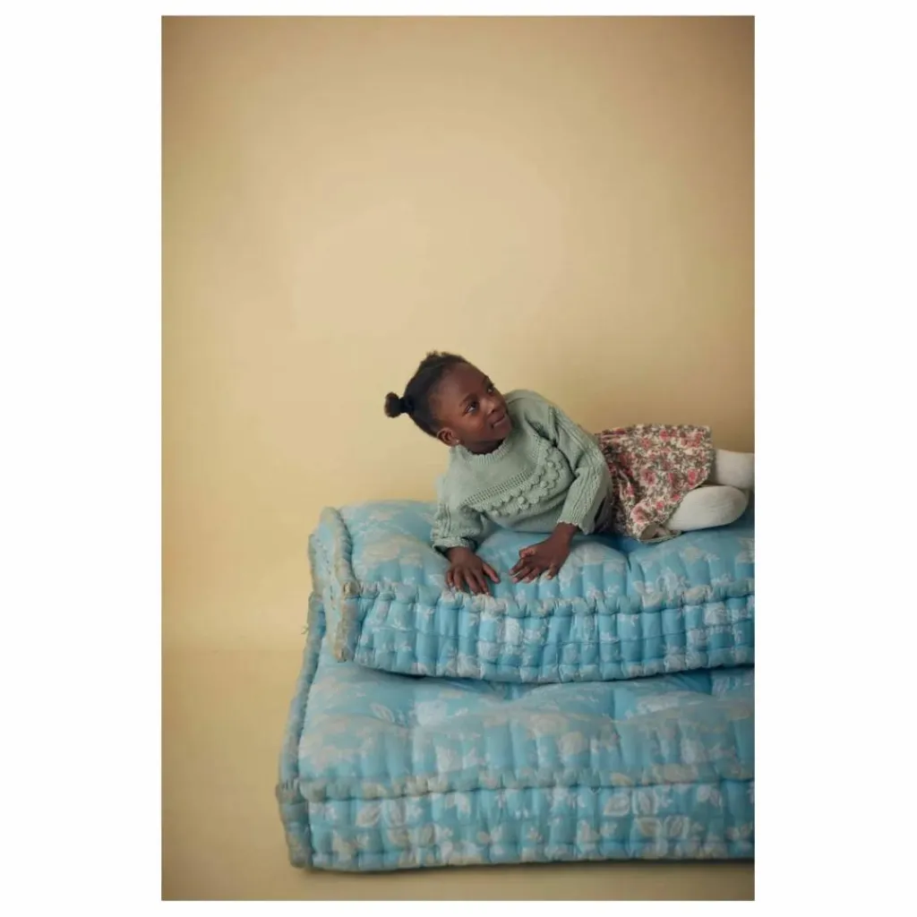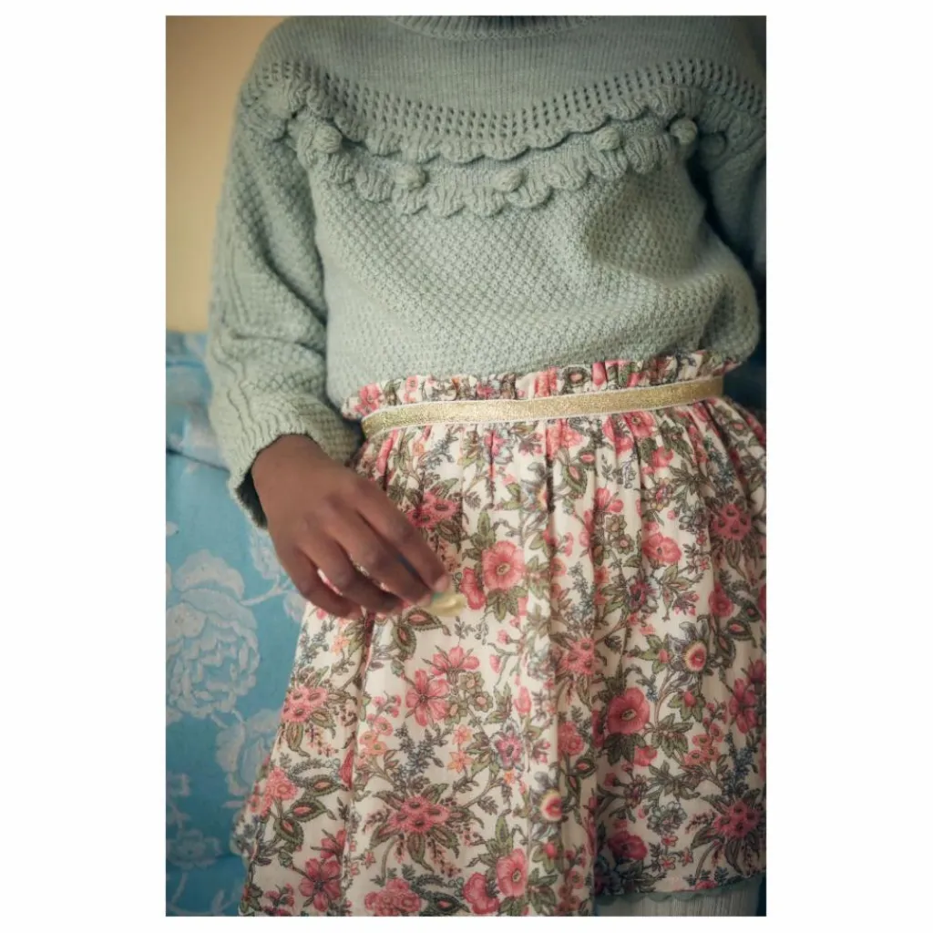 Détails ajourés, volants festonnés et pompons appliqués à la main sur le devant.