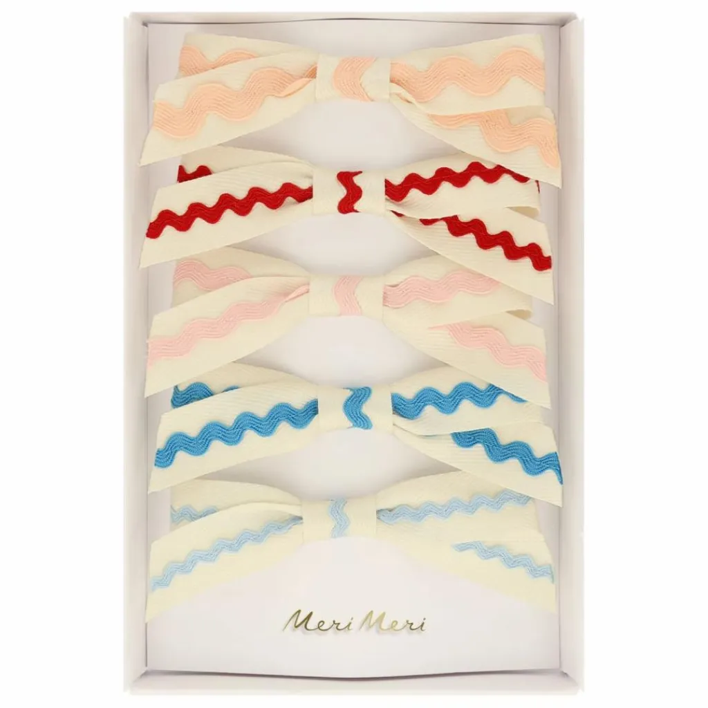 - Ensemble de 5 couleurs de ric rac – pêche, rouge, rose, bleu et menthe. Noeuds en ruban tissé blanc cassé. Barrette dorée