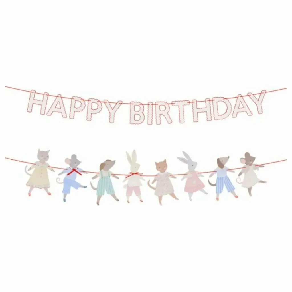 - Cette guirlande est répartie sur 2 cordes. Une chaîne porte l’expression « Joyeux anniversaire » écrite en fanions crème et rouges.. La deuxième chaîne présente un défilé d’adorables fanions d’animaux, avec des motifs sur le devant et le dos.