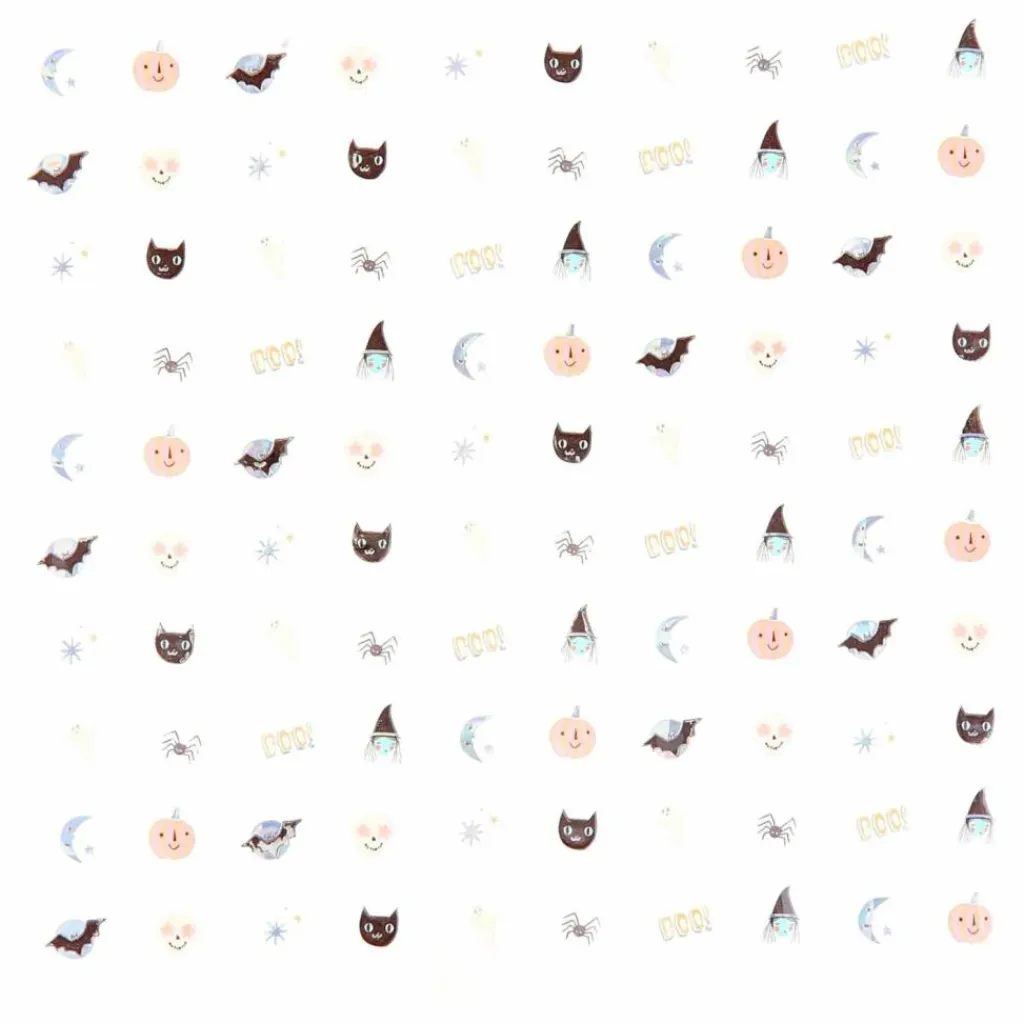 - Le set comprend 200 stickers pour ongles. 10 motifs différents : chats noirs, araignées, sorcières, chauves-souris, crânes, citrouilles, étoiles, lunes, fantômes et l’inscription « Boo! ». Détails holographiques scintillants. Présenté dans un packaging citrouille rayé rose et orange, ce set fait un cadeau original et festif.