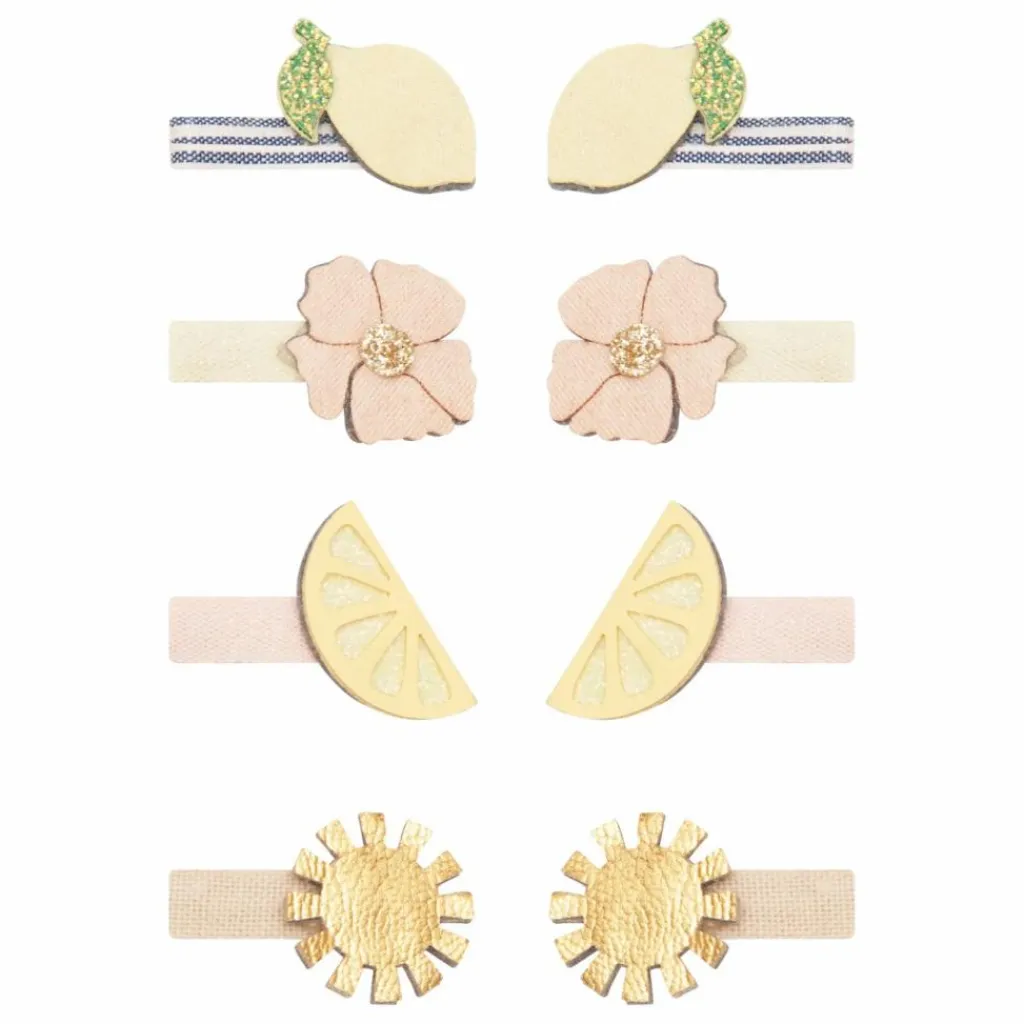 - Ces adorables mini-clips Amalfi nous font rêver de journées ensoleillées et de paysages pittoresques… que vous restiez à la maison ou que vous partiez en avion, ce magnifique petit paquet de clips ajoutera un charme estival à toutes vos tenues ! 8 par paquet Clips crocodiles recouverts de tissu Citrons, fleurs et soleil, tous fabriqués à partir d’un joli mélange de suède doux, de paillettes et de tissus métalliques Attention ! Ne convient pas aux enfants de moins de 36 mois