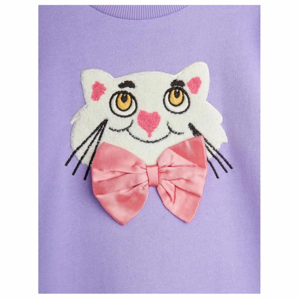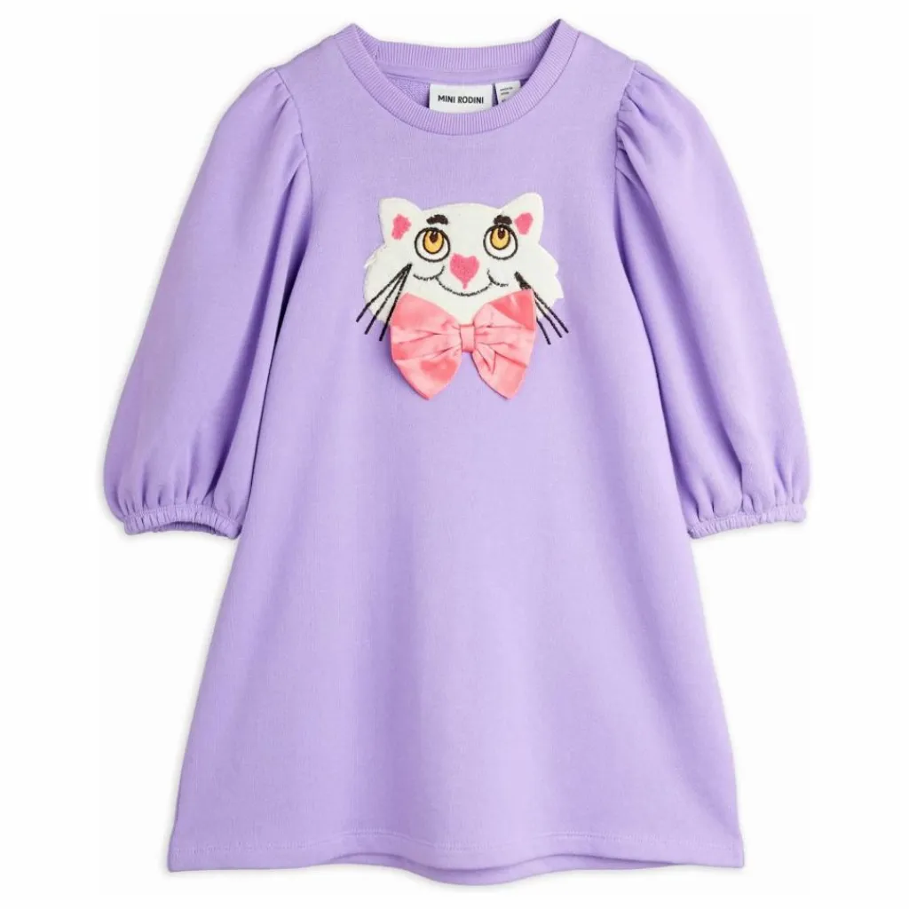 - Sweatdress featuring a chenille patch of a cat wearing a silk bowtie