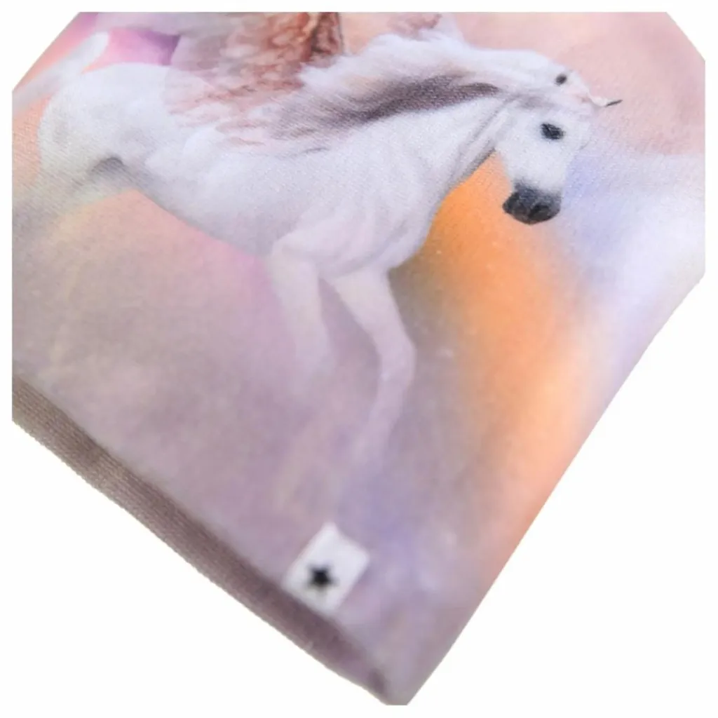 - Ensemble bonnet et gants multicolores de Molo avec une licorne et un arc-en-ciel. Taille S/M 3-6 ans. Taille M/L 7-12 ans.