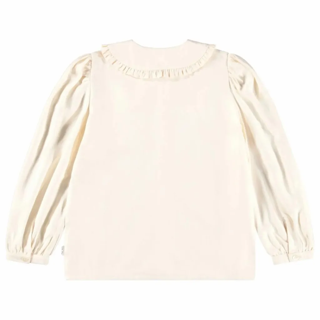 - Cette chemise crème de Molo est réalisée en viscose douce et confortable. Elle présente un col Peter Pan classique avec des volants décoratifs, de longues manches volumineuses avec des poignets étroits et une fermeture boutonnée sur le devant avec des boutons blancs.