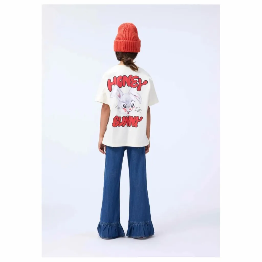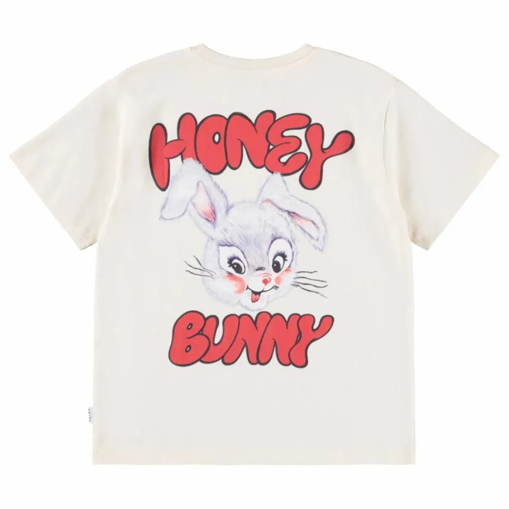 - Ce t-shirt blanc cassé de Molo est fabriqué en coton biologique doux et présente des manches courtes et une encolure côtelée. Il présente une coupe ample et un large imprimé au dos représentant un lapin et le texte » Honey Bunny « .