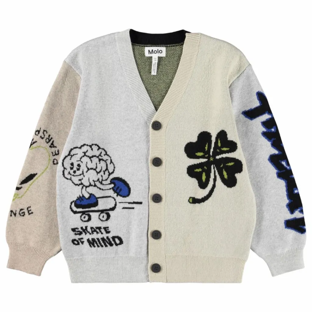- Ce cardigan tricoté multicolore de Molo est fait de coton et de laine et présente une encolure en V, des boutons, une patte de boutonnage côtelée et des bords côtelés autour des manches et de la taille. Le cardigan a une coupe régulière et un motif de divers graphiques, ainsi qu’un grand alien dans le dos.