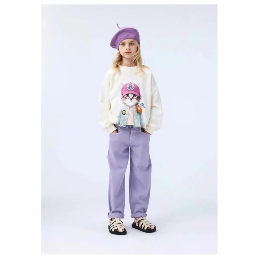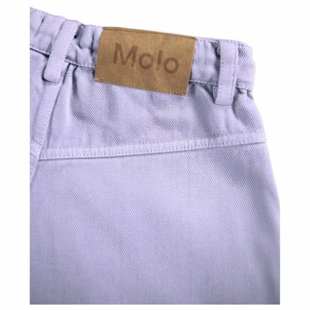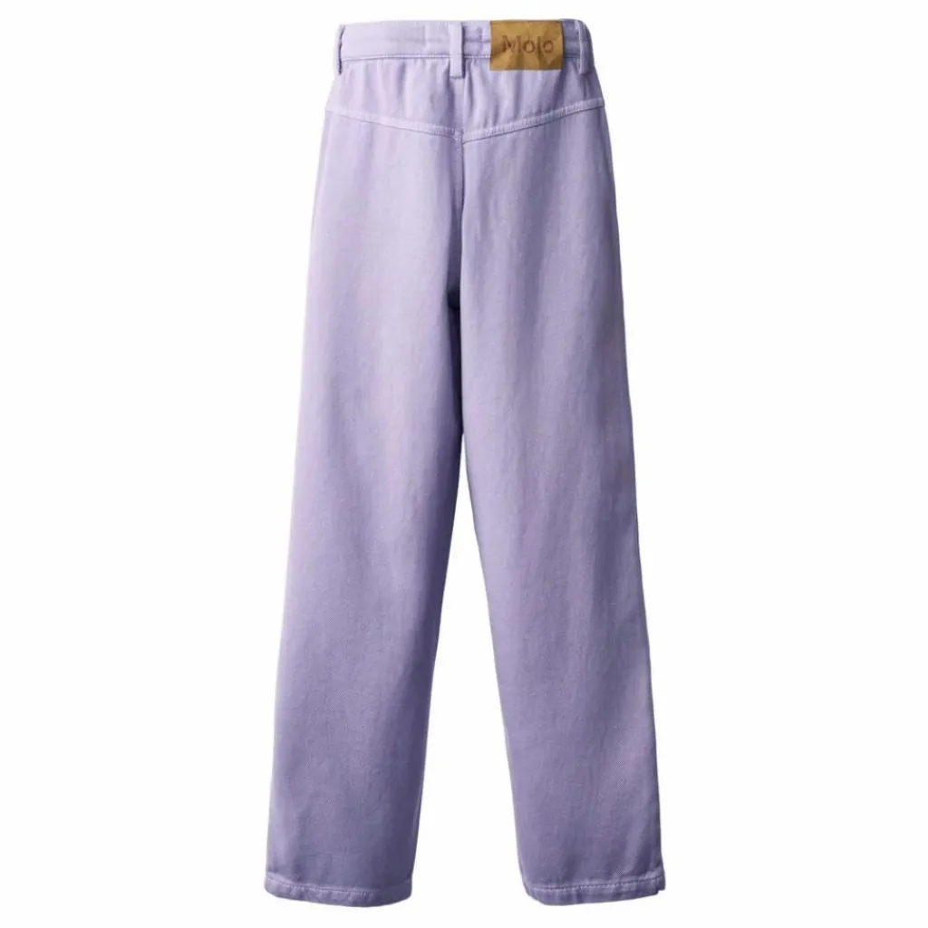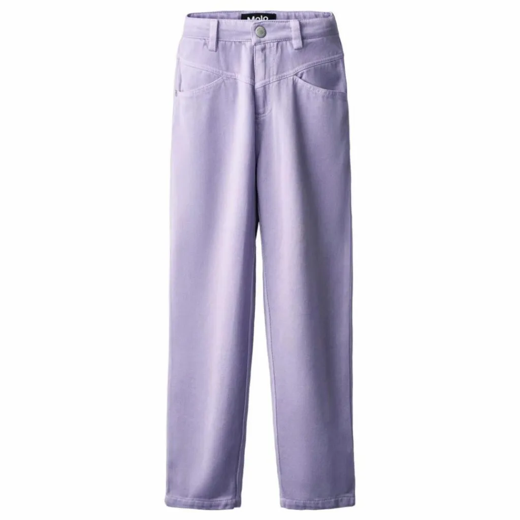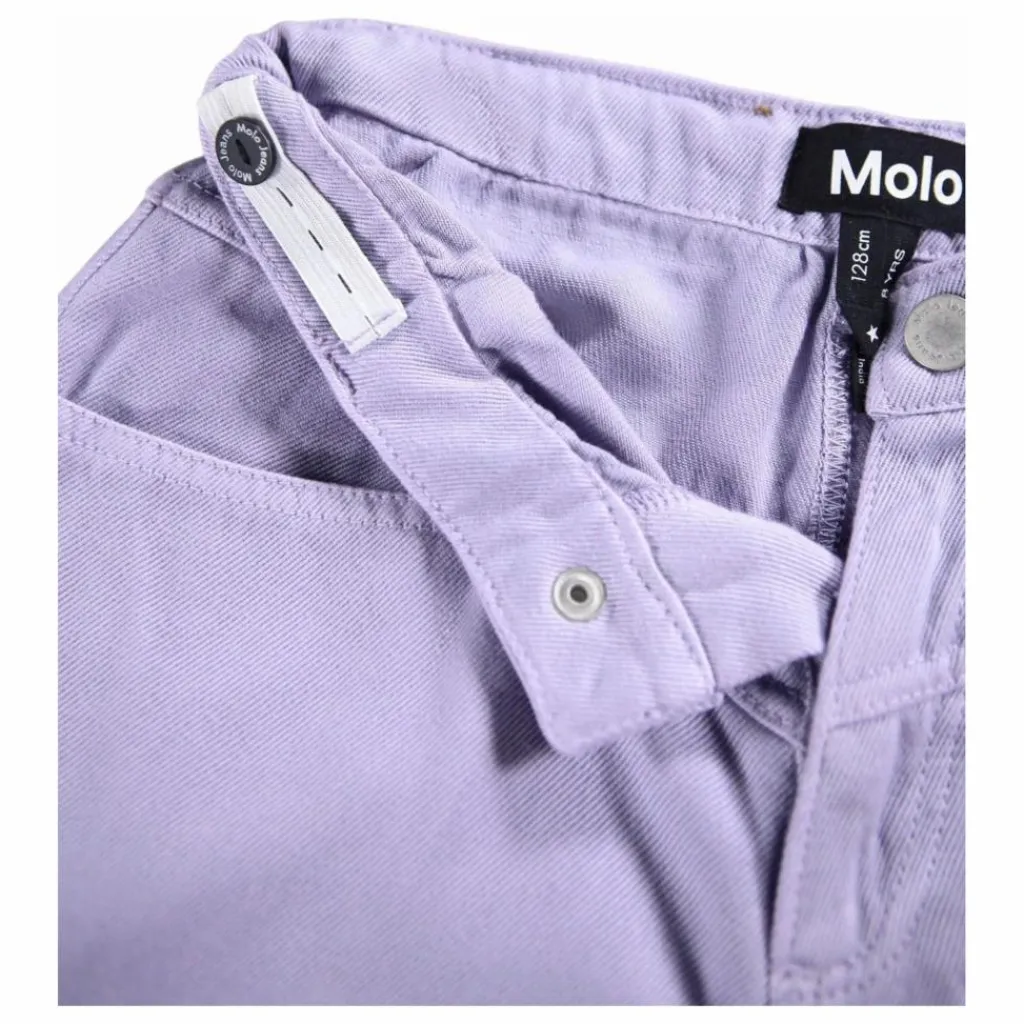 - Ce jean violet clair de Molo présente des coutures assorties en coton et viscose. Le jean présente des coutures sur le devant et deux poches latérales. La taille peut être ajustée à l’aide d’un élastique interne pour un ajustement optimal à tous les enfants. Les tailles 92-134 sont dotées d’un bouton pression, tandis que les tailles 140-176 sont dotées d’un bouton de jean normal.
