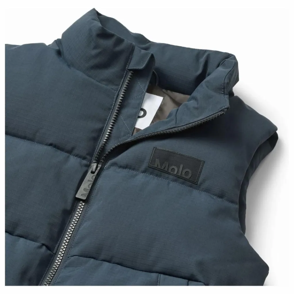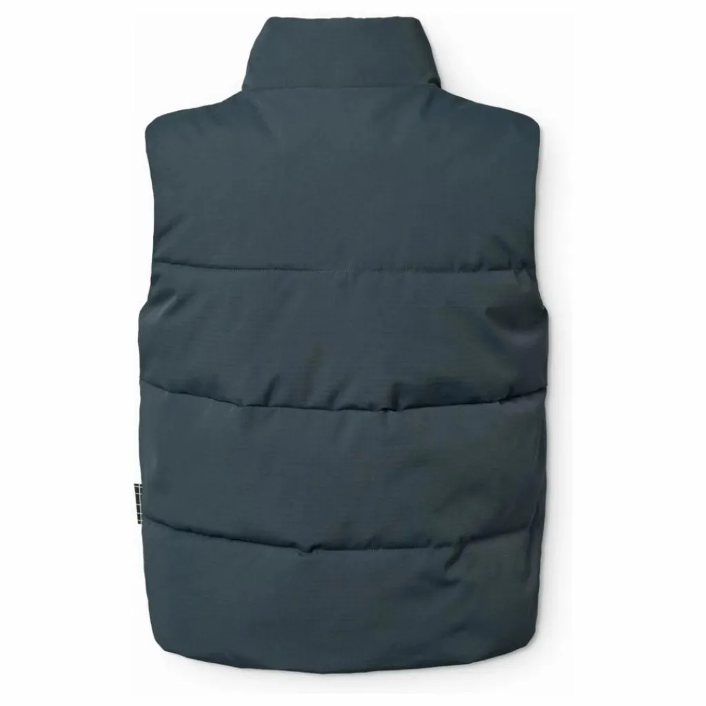 - Ce gilet bleu foncé en nylon recyclé est doté d’une fermeture éclair frontale pratique, d’un col montant et de larges emmanchures, ce qui permet d’y glisser une veste ou un pull épais. Le gilet est doté de poches frontales, d’une poche intérieure et d’un élastique interne réglable en bas pour empêcher le vent de pénétrer. Caractéristiques : Résistant au vent et à l’eau. Pression de la colonne d’eau : 5 000 mm. Respirabilité : 5 000 g/m2/24 h. Sans PFC (PFOS et PFOA). de Molo.