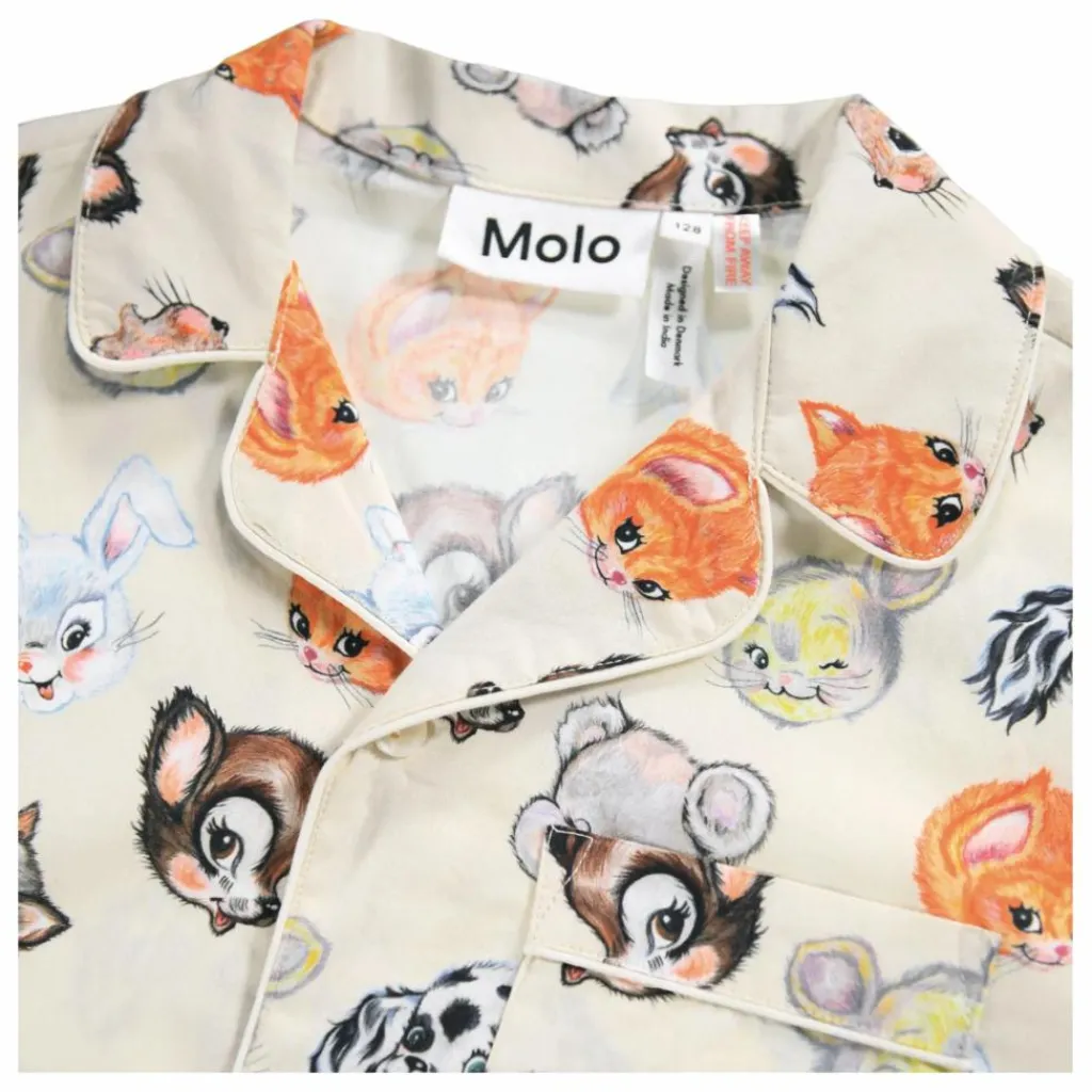 - Cet ensemble pyjama blanc cassé en coton biologique de Molo se compose d’un pantalon à jambes longues et d’une taille élastique avec cordon de serrage. Le haut a des manches longues, un col, une poche sur la poitrine et des boutons sur le devant. L’ensemble a une coupe régulière et un imprimé coloré d’animaux mignons dessinés.