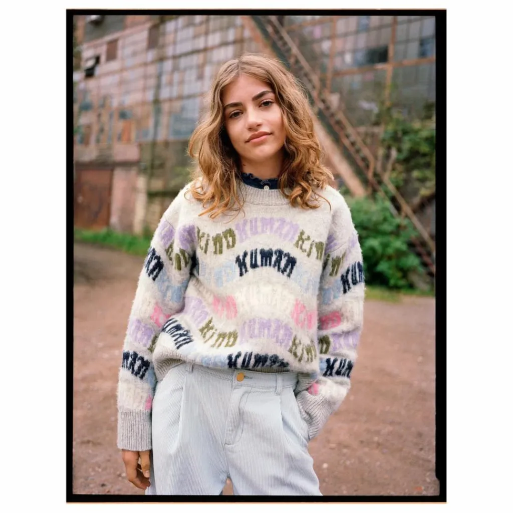 - Ce pull oversize gris clair en laine de Molo présente un motif multicolore avec le texte ‘Humankind’ tissé tout autour. Le pull a une coupe ample et des bords côtelés autour du cou, des manches et de la taille.