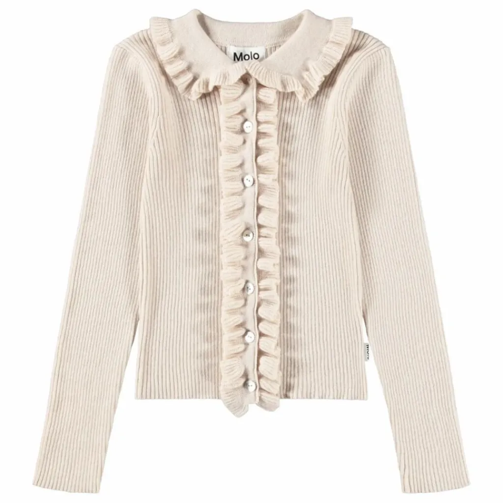 - Ce joli cardigan blanc cassé de Molo est ajusté et composé d’un mélange de laine et de coton. Il est doté d’un joli col à volants et de volants le long de la fermeture à boutons sur les deux côtés. Il est côtelé et doté de magnifiques boutons en nacre.