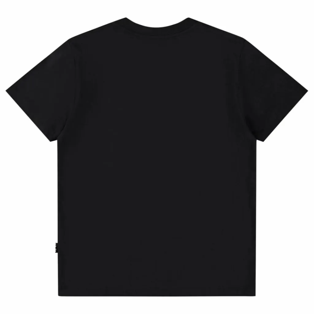 - Ce T-shirt noir de Molo est fabriqué en coton biologique doux, avec des manches courtes et une encolure côtelée. Le T-shirt a une coupe ample et un imprimé blanc d’un visage souriant sur le devant.
