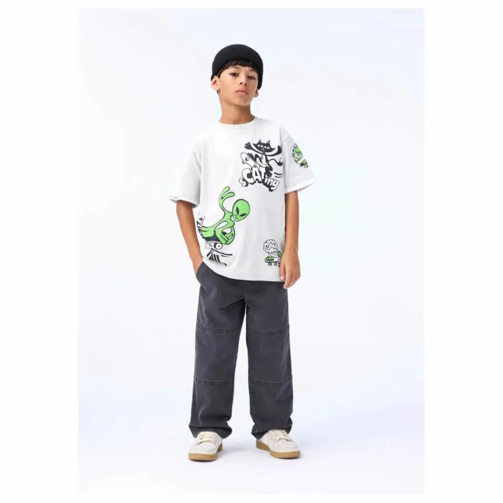 - Ce t-shirt beige de Molo est fabriqué en coton biologique doux et présente des manches courtes et une encolure côtelée. Ce t-shirt à la coupe oversize est imprimé d’un chat, d’un extraterrestre et d’un cerveau sur un skateboard. Il est recommandé de choisir une taille plus petite pour une coupe moins ample, surtout si l’enfant est entre deux tailles.