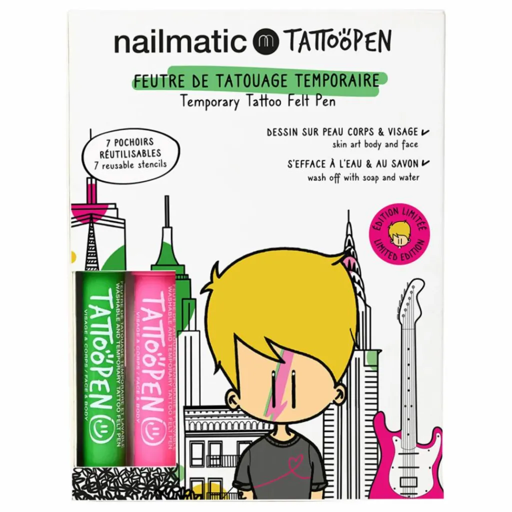 - Contient 2 feutres de tatouage temporaire et 7 pochoirs réutilisables.