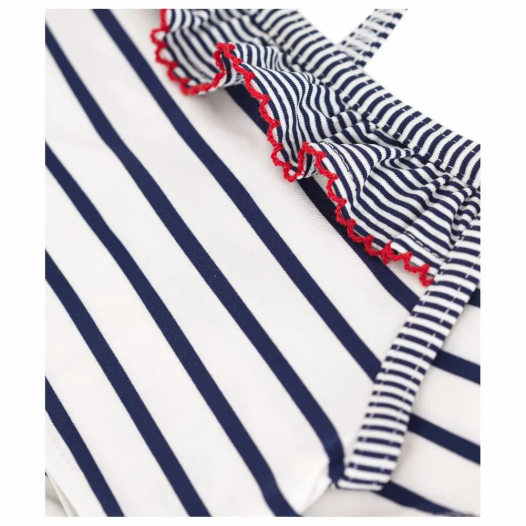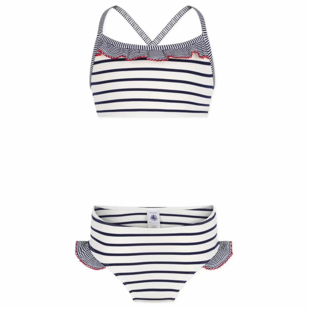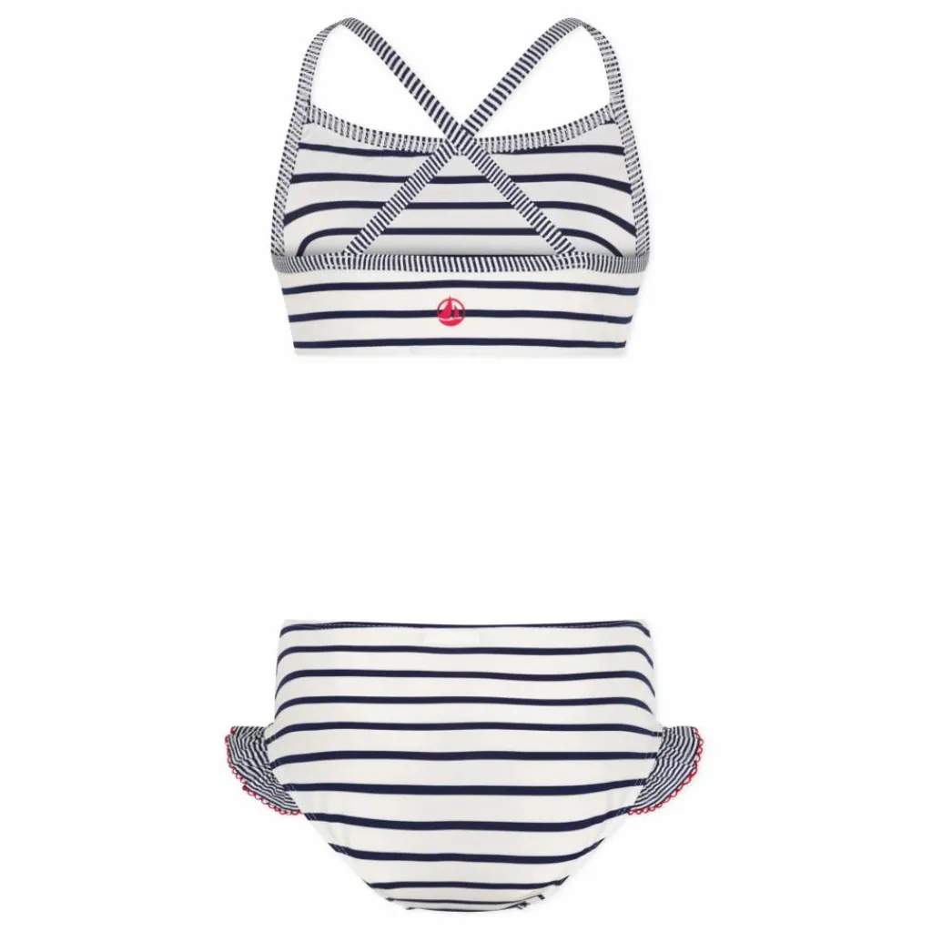 - Maillot de bain deux pièces en polyamide. Le haut, en forme de soutien-gorge, présente un décolleté légèrement arrondi sur le devant et des bretelles croisées dans le dos. Le bas a une forme de culotte classique, avec des détails de volants sur les cuisses.