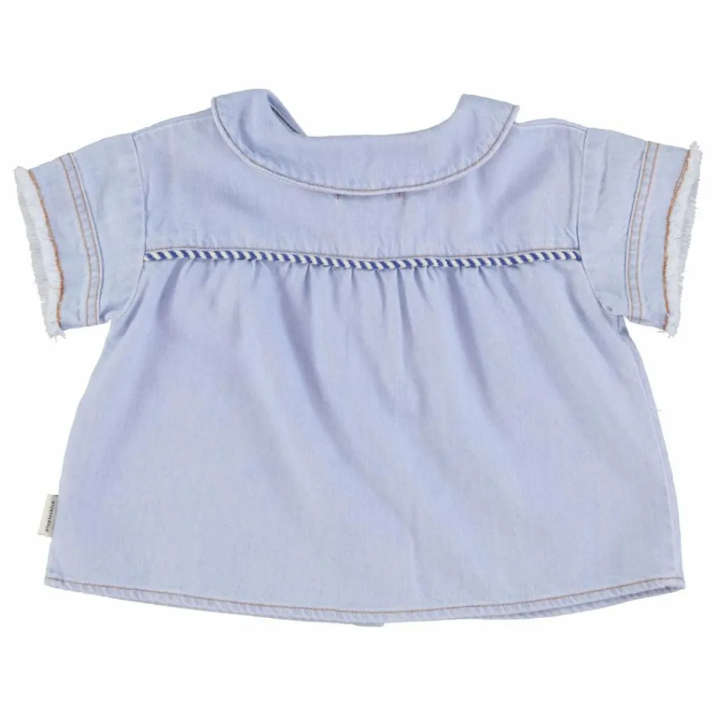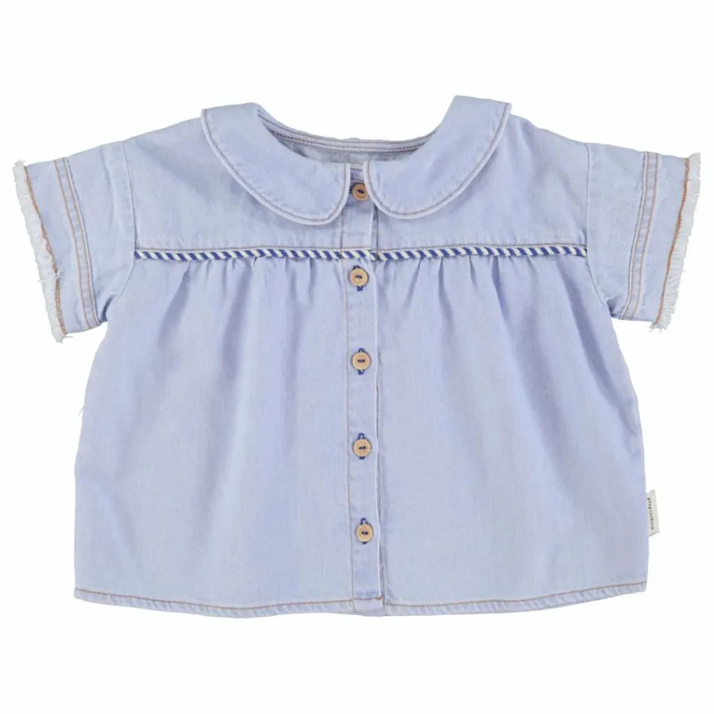- Chemise à col Peter Pan en denim souple avec manches courtes terminées par des franges. Boutons en bois sur le devant. Passepoil sur la poitrine.