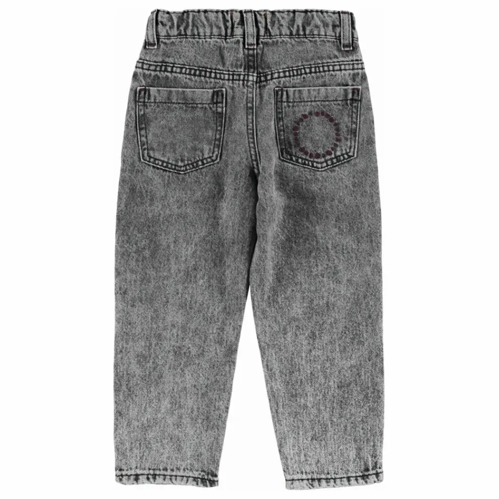 - Pantalon unisexe en denim avec taille réglable. Broderie du logo bordeaux sur une poche arrière.