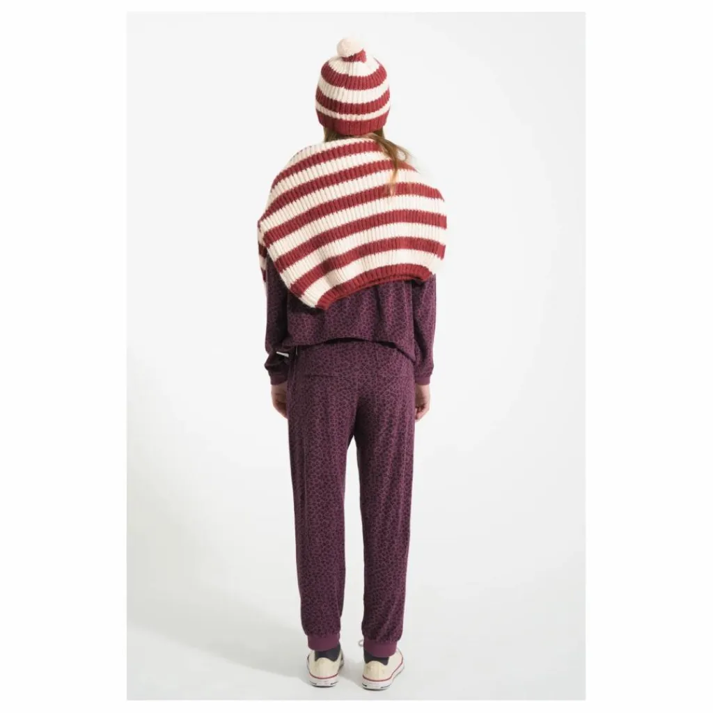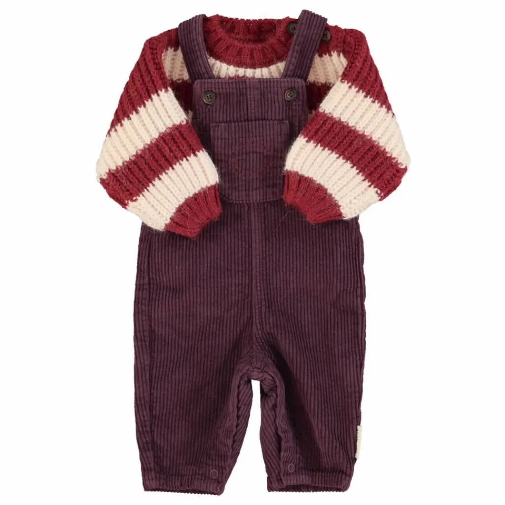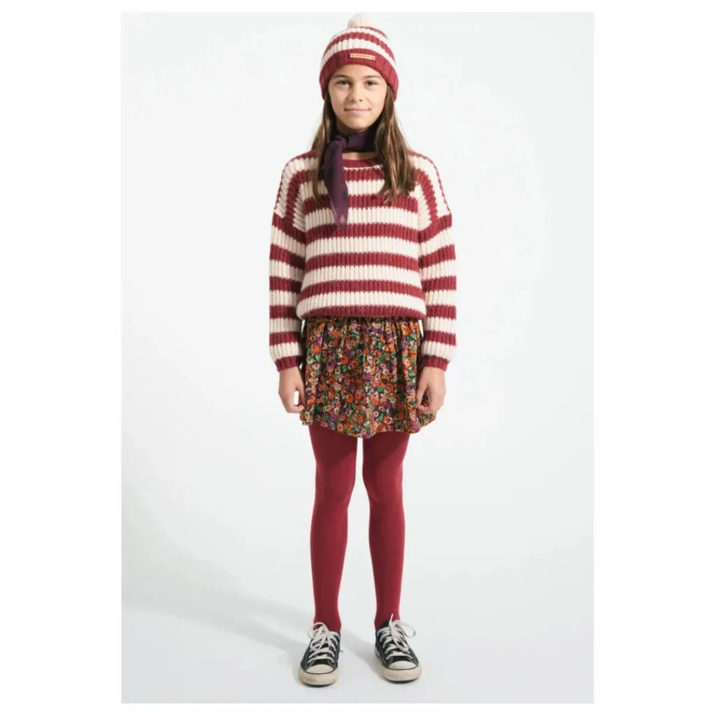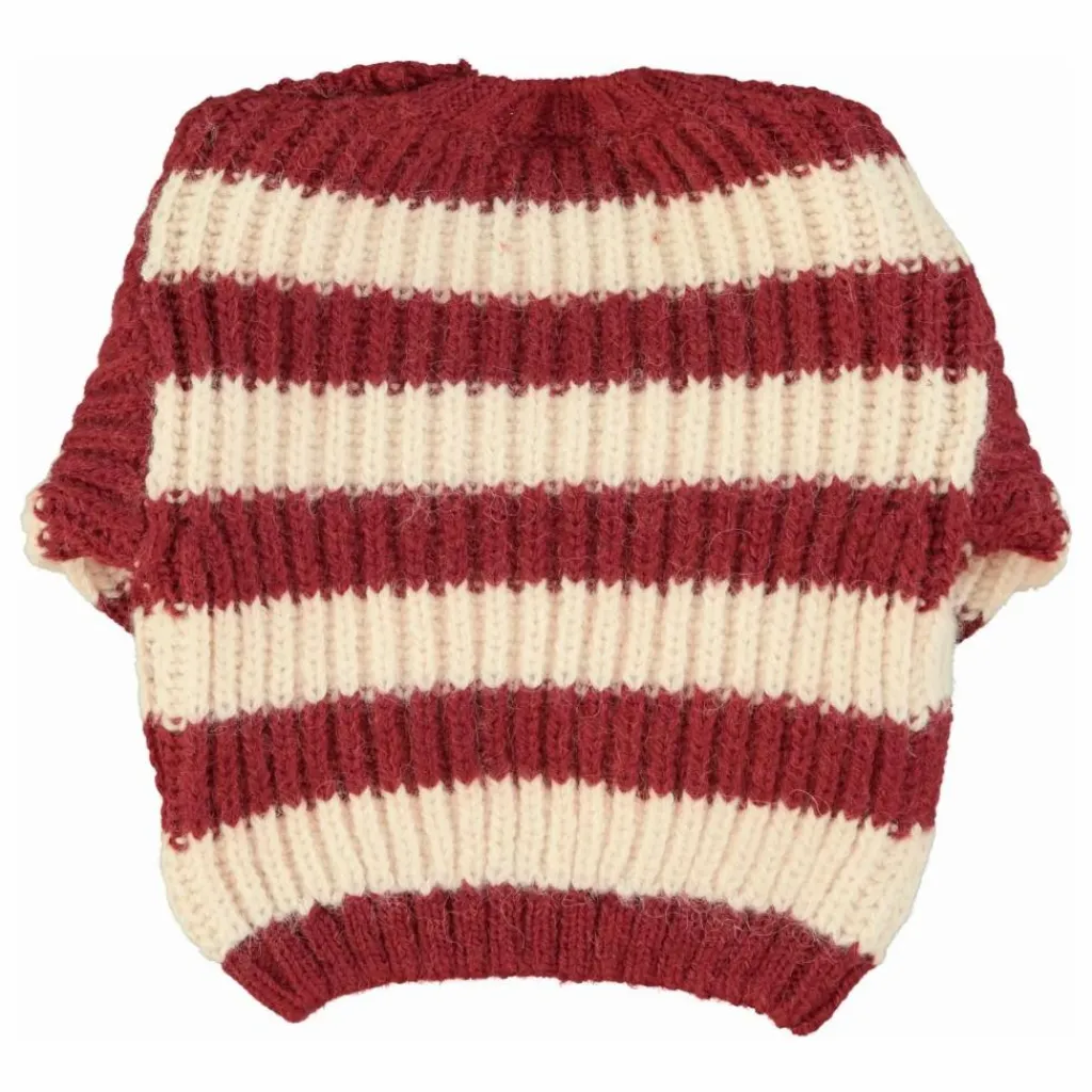 - Pull en maille à rayures bordeaux et rose pâle, avec étiquette logo en cuir. Les tailles bébé ont des boutons sur l’épaule.